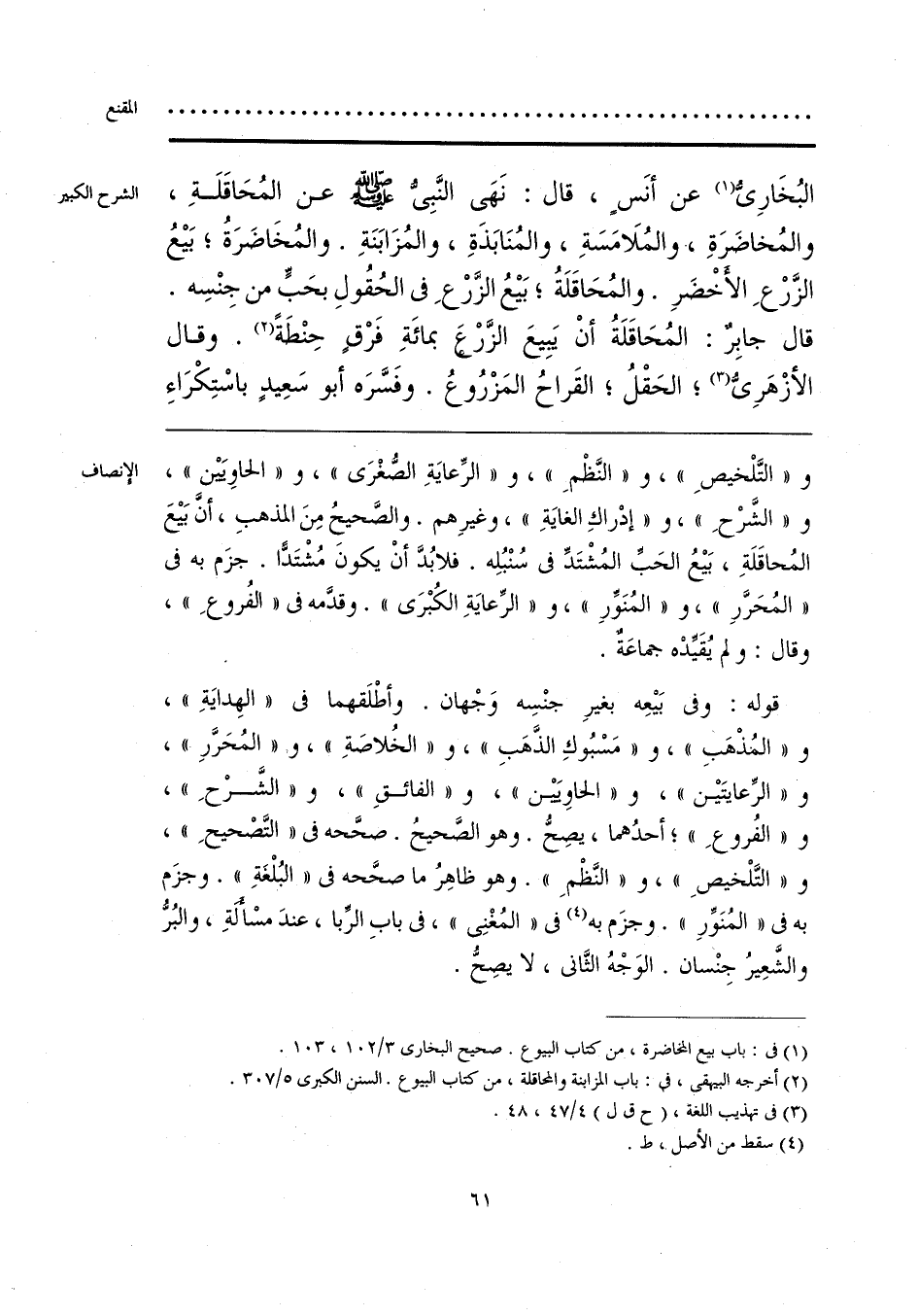 و «التَّلْخيصِ»، و «النَّظْمِ»، و «الرِّعايَةِ الصُّغْرَى»، و «الحاويَين»، و «الشَّرْحِ»، و «إدْراكِ الغايَةِ»، وغيرِهم. والصَّحيحُ مِنَ المذهبِ، أنَّ بَيعَ المُحاقَلَةِ، بَيعُ الحَحب المُشْتَدِّ في سُنْبُلِه. فلابُدَّ أنْ يكون مُشْتَدًّا. جزَم به في «المُحَرَّرِ»، و «المُنَوِّرِ»، و «الرِّعايَةِ الكُبْرَى». وقدَّمه في «الفُروعِ»، وقال: ولم يُقَيِّدْه جماعَةٌ.