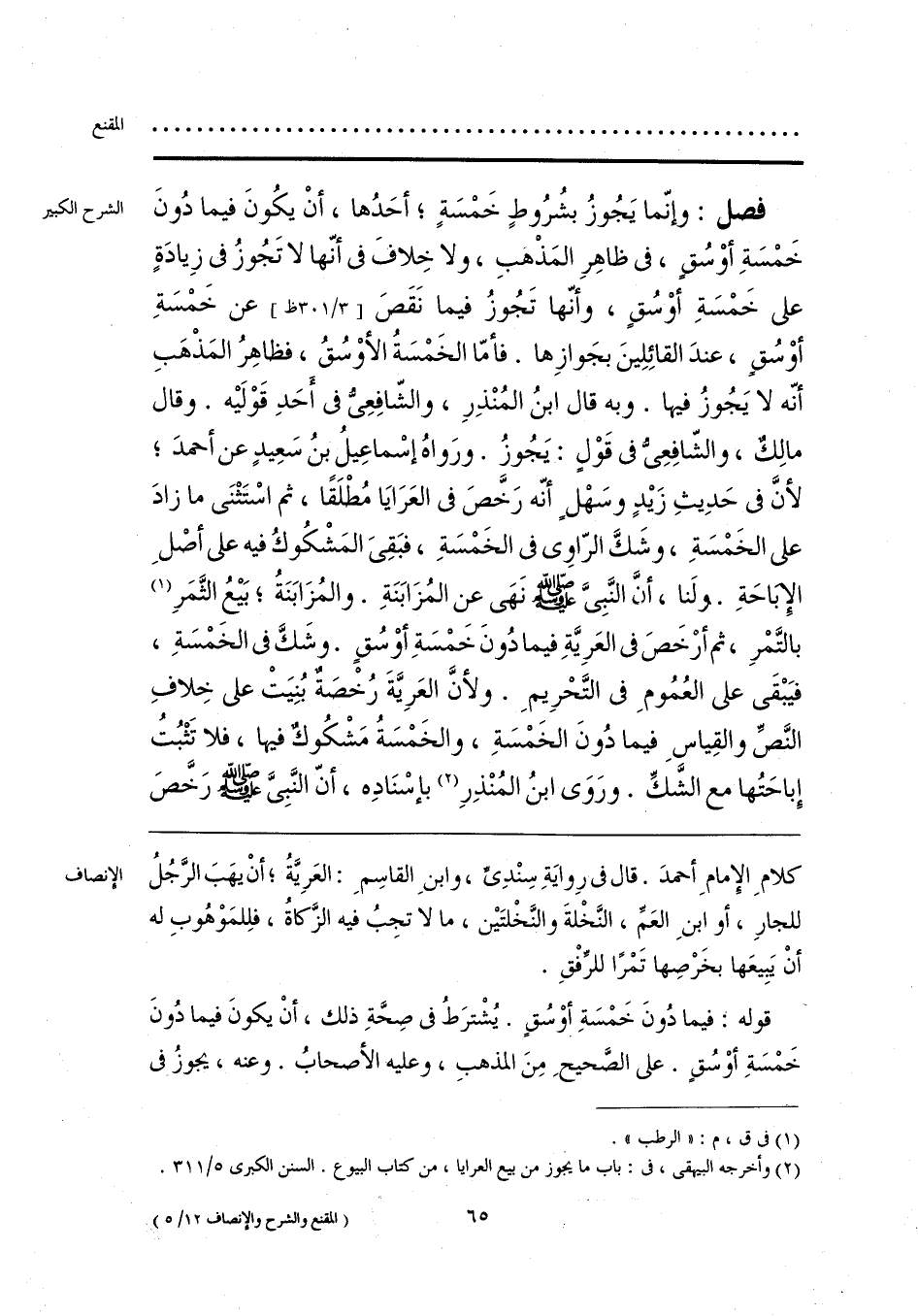 قوله: فيما دُونَ خَمْسَةِ أوْسُقٍ. يُشْترَطُ في صِحَّةِ ذلك، أنْ يكونَ فيما دُونَ خَمْسَةِ أوْسُقٍ. على الصَّحيحِ مِنَ المذهبِ، وعليه الأصحابُ. وعنه، يجوزُ في