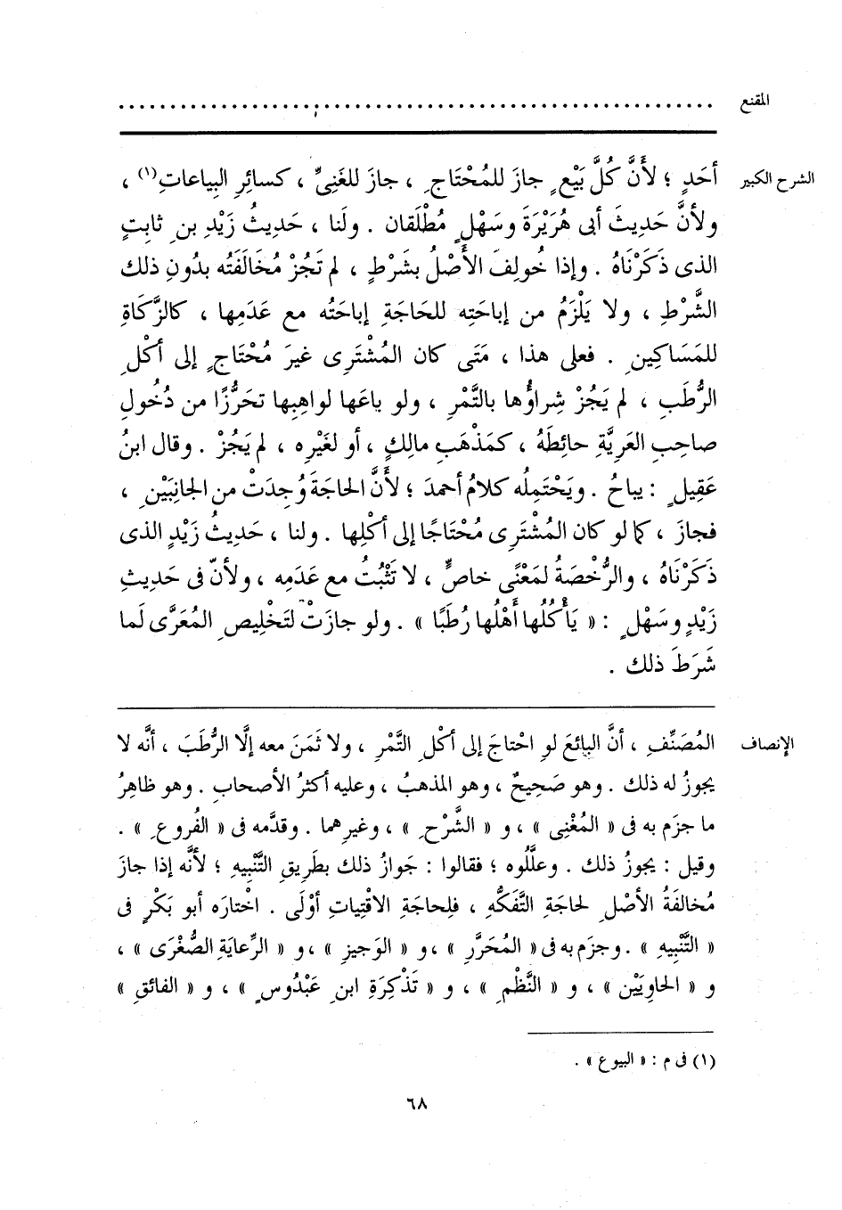 المُصنِّفِ، أنَّ البائعَ لو احْتاجَ إلى أكْلِ التَّمْرِ، ولا ثَمَنَ معه إلَّا الرطَبَ، أنَّه لا يجوزُ له ذلك. وهو صَحِيحٌ، وهو المذهبُ، وعليه أكثرُ الأصحابِ. وهو ظاهِرُ ما جزَم به في «المُغْنِي»، و «الشَّرْحِ»، وغيرِهما. وقدَّمه في «الفُروعِ». وقيل: يجوزُ ذلك. وعلَّلُوه؛ فقالوا: جَوازُ ذلك بطَرِيقِ التنبِيهِ؛ لأنَّه إذا جازَ مُخالفَةُ الأصْلِ لحاجَةِ التَّفَكُّهِ، فلِحاجَةِ الاقْتِياتِ أوْلَى. اخْتارَه أبو بَكْر في «التنْبِيهِ». وجزَم به في «المُحَرَّرِ»، و «الوَجيزِ»، و «الرِّعايَةِ الصُّغْرَى»، و «الحاويَين»، و «النَّظْمِ»، و «تَذْكِرَةِ ابنِ عَبْدُوسٍ»، و «الفائقِ»