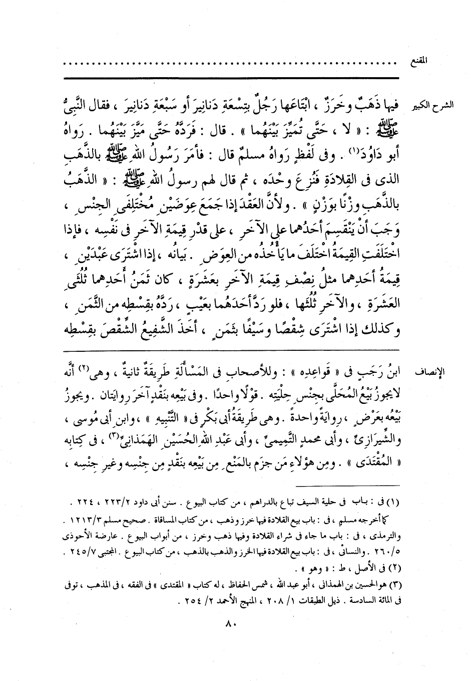 ابنُ رَجَبٍ في «قَواعِدِه»: وللأصحابِ في المَسْأَلةِ طَرِيقَةٌ ثانيةٌ، وهي (¬1) أنَّه لا يجوزُ بَيعُ المُحَلَّى بجِنْسِ حِلْيَيه. قوْلًا واحدًا. وفي بَيعِه بنَقْدٍ آخَرَ رِوايَتان. ويجوزُ بَيعُه بعَرْض، رِوايَةً وا حدةً. وهي طَرِ يقَةُ أبي بَكْر في «التَّنْبِيهِ»، وابنِ أبي مُوسى، والشيرَازِيِّ، وأبي محمدٍ التَّمِيمي، وأبي عَبْدِ اللهِ الحُسَينِ الهَمَذانِيِّ (¬2)، في كِتابِه «المُقْتَدَى». ومِن هؤلاءِ مَن جزَم بالمَنْعِ مِن بَيعِه بنَقْدٍ مِن جِنْسِه وغيرِ جِنْسِه،