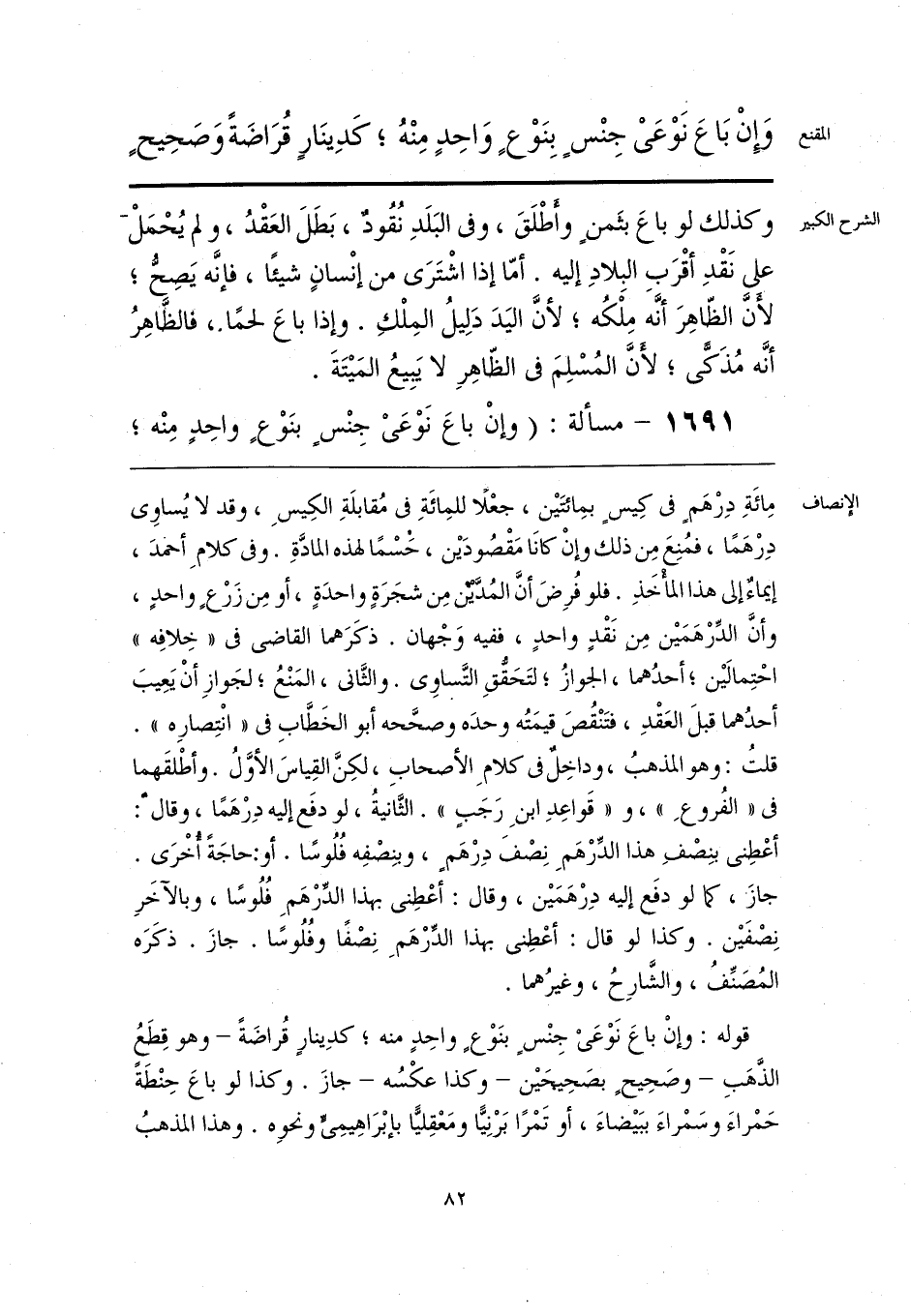 مِائَةِ دِرْهَم في كِيسٍ بمِائتَين، جعْلًا للمِائَةِ في مُقابلَةِ الكِيسِ، وقد لا يُساوي دِرْهَمًا، فمُنِعَ مِن ذلك وإنْ كانَا مَقْصُودَين، حَسْمًا لهذه المادَّةِ. وفي كلامِ أحمدَ، إيماءٌ إلى هذا المأخَذِ. فلو فُرِضَ أنَّ المُدَّين مِن شجَرَةٍ واحدَةٍ، أو مِن زَرْع واحدٍ، وأنَّ الدِّرْهَمَين مِن نَقْدٍ واحدٍ، ففيه وَجْهان. ذكَرَهما القاضي في «خِلافِه» احْتِمالين؛ أحدُهما، الجوازُ؛ لتَحَقُّقِ التَّساوي. والثَّاني، المَنْعُ؛ لجَوازِ أنْ يَعِيبَ أحدُهما قبلَ العَقْدِ، فتَنْقُصَ قيمَتُه وحدَه وصحَّحه أبو الخَطَّابِ في «انْتِصارِه». قلتُ: وهو المذهبُ، وداخِل في كلامِ الأصحابِ، لكِنَّ القِياسَ الأوَّلُ. وأطْلقَهما في «الفُروعِ»، و «قَواعِدِ ابنِ رَجَبٍ». الثَّانيةُ، لو دفَع إليه دِرْهَمًا، وقال: أعْطِني بنِصْفِ هذا الدِّرْهَمِ نِصْفَ دِرْهَم، وبنِصْفِه فُلُوسًا. أو: حاجَةً أُخْرَى. جازَ، كما لو دفَع إليه دِرْهَمَين، وقال: أعْطِني بهذا الدِّرْهَمِ فُلُوسًا، وبالآخَرِ نِصْفَين. وكذا لو قال: أعْطِني بهذا الدرهَمِ نِصْفًا وفُلُوسًا. جازَ. ذكَرَه المُصَنِّفُ، والشَّارِحُ، وغيرُهما.