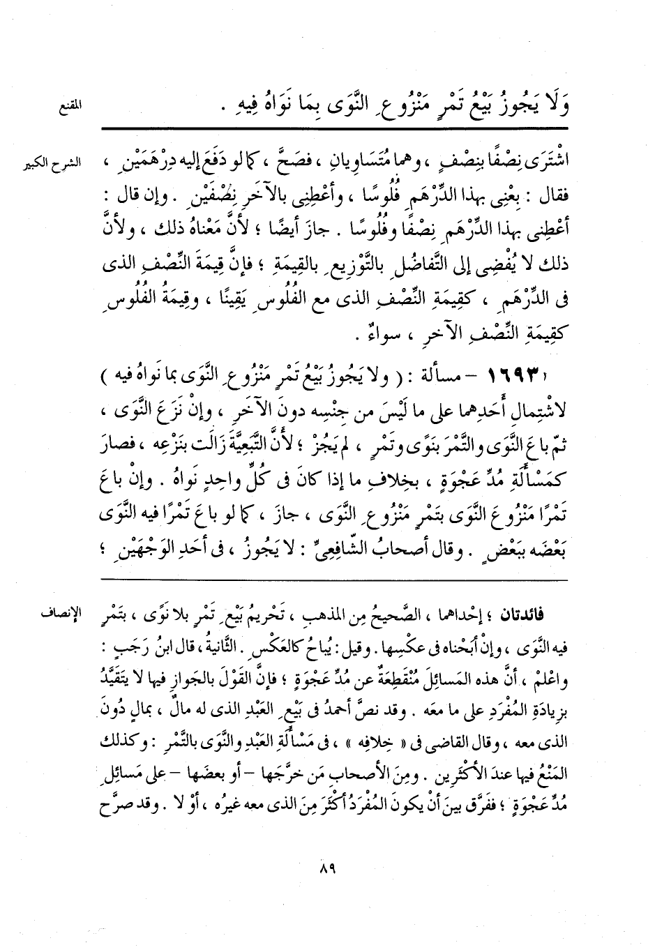فائدتان؛ إحْداهما، الصَّحيحُ مِن المذهبِ، تَحْريمُ بَيعِ تَمْرٍ بلا نَوًى، بتَمْرٍ فيه النَّوَى، وإنْ أبَحْناه في عكْسِها. وقيل: يُباحُ كالعَكْسِ. الثَّانيةُ، قال ابنُ رَجَبٍ: واعْلمْ، أنَّ هذه المَسائِلَ مُنْقَطِعَةٌ عن مُدِّ عَجْوَةٍ؛ فإنَّ القَوْلَ بالجَوازِ فيها لا يتَقَيَّدُ بزِيادَةِ المُفْرَدِ على ما معَه. وقد نصَّ أحمدُ في بَيعِ العَبْدِ الذي له مالٌ، بمالٍ دُونَ الذي معه، وقال القاضي في «خِلافِه»، في مَسْأَلَةِ العَبْدِ والنَّوَى بالتَّمْرِ: وكذلك المَنْعُ فيها عندَ الأكْثَرِين. ومِنَ الأصحاب مَن خرَّجَها -أو بعضَها- على مَسائِل مُدِّ عَجْوَةٍ؛ ففَرَّق بينَ أنْ يكونَ المُفْرَدُ أكْثَرَ مِنَ الذي معه غيرُه، أوْ لا. وقد صرَّح