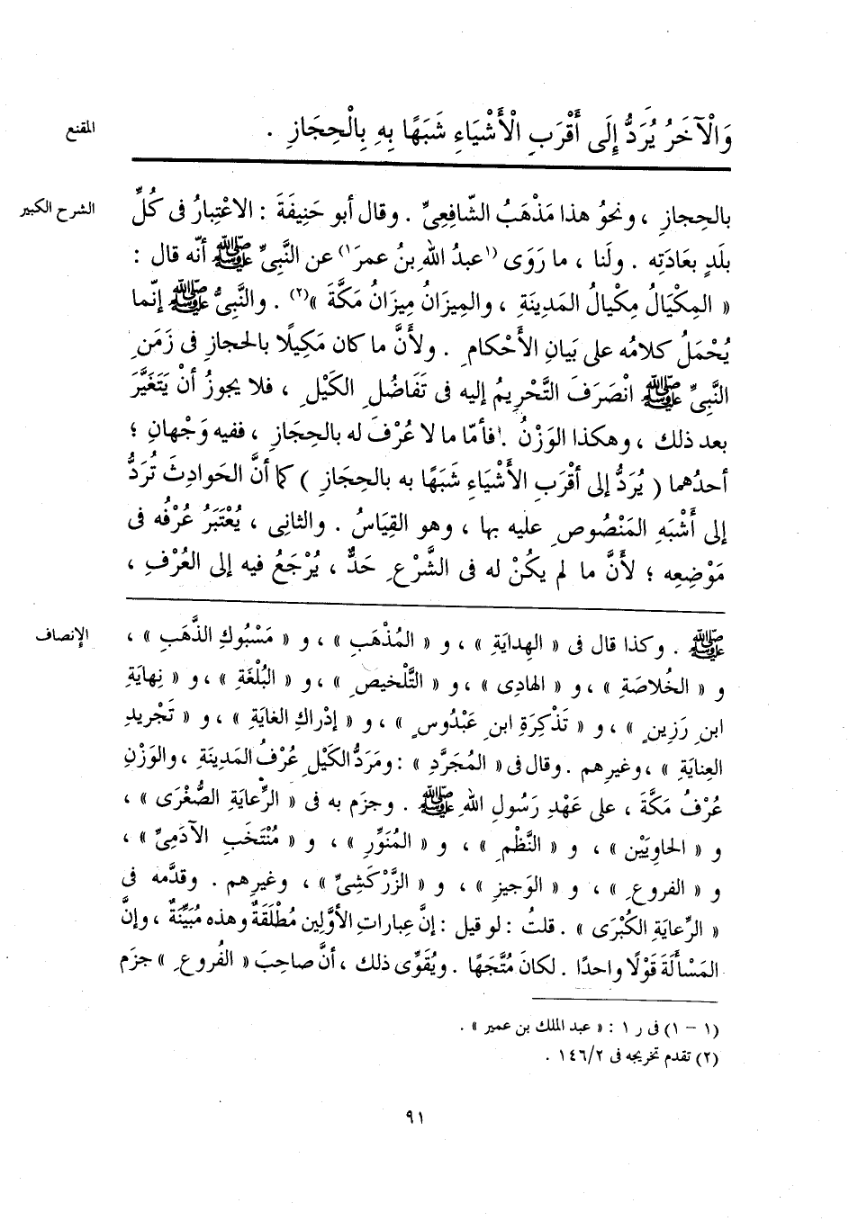 - صلى الله عليه وسلم -. وكذا قال في «الهِدايَةِ»، و «المُذْهَبِ»، و «مَسْبُوكِ الذهَبِ»، و «الخُلاصَةِ»، و «الهادِي»، و «التَّلْخيصِ»، و «البُلْغَةِ»، و «نِهايَةِ ابنِ رَزِينٍ»، و «تَذْكِرَةِ ابنِ عَبْدُوسٍ»، و «إدْراكِ الغايَةِ»، و «تَجْريدِ العِنايَةِ»، وغيرِهم. وقال في «المُجَردِ»: ومَرَدُّ الكَيلِ عُرْفُ المَدِينَةِ، والوَزْنِ عُرْفُ مَكَّةَ، على عَهْدِ رَسُولِ اللهِ - صلى الله عليه وسلم -. وجزَم به في «الرِّعايَةِ الصُّغْرَى»، و «الحاويَيْن»، و «النَّظْمِ»، و «المُنَوِّرِ»، و «مُنْتَخَبِ الآدَمِيِّ»، و «الفروعِ»، و «الوَجيزِ»، و «الزَّرْكَشِيِّ»، وغيرِهم. وقدَّمه في «الرِّعايَةِ الكُبْرَى». قلتُ: لو قيل: إنَّ عِباراتِ الأوَّلِين مطلَقَةٌ وهذه مُبَيِّنَةٌ، وإنَّ المَسْأَلَةَ قَوْلًا واحدًا. لكانَ مُتَّجَهًا. ويُقَوى ذلك، أنَّ صاحِبَ «الفُروعِ» جزَم