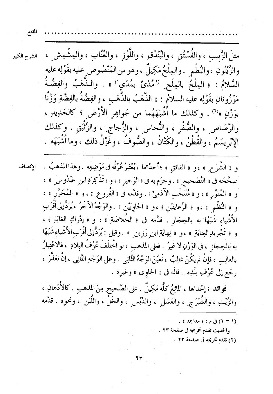 و «الشَّرْحِ»، و «الفائقِ»، أحدُهما، يُعْتَبرُ عُرْفُه في مَوْضِعِه. وهذا المذهبُ. صحَّحَه في «التَّصْحيحِ». وجزَم به في «الوَجيزِ»، و «تَذْكِرَةِ ابنِ عَبْدُوسٍ»، و «المُنَوِّرِ»، و «مُنْتَخَبِ الآدَمِيِّ». وقدَّمه في «الفُروعِ»، و «المُحَرَّرِ»، و «النَّظْمَ»، و «الرِّعايتَين»، و «الحاويَيْن». والوَجْهُ الآخَرُ، يُرَدُّ إلى أقْرَبِ الأشْياءِ شَبَهًا به بالحِجَازِ. قدَّمه في «الخُلاصَةِ»، و «إدْراكِ الغايَةِ»، و «تَجْريدِ العِنايَةِ»، و «نِهايَةِ ابنِ رَزِينٍ». وقيل: يُرَدُّ إلى أقْرَبِ الأشْياءِ شَبَهًا به بالحِجازِ، في الوَزْنِ لا غيرُ. فعلى المذهبِ، لو اخْتلَفَ عُرْفُ البِلادِ، فالاعْتِبارُ بالغالِبِ، فإنْ لم يكُنْ غالِب، تَعيَّنَ الوَجْهُ الثَّانِي. وعلى الوَجْهِ الثَّانِي، إنْ تعَذَّرَ، رجَع إلى عُرْفِ بلَدِه. قاله في «الحاوي» وغيرِه.