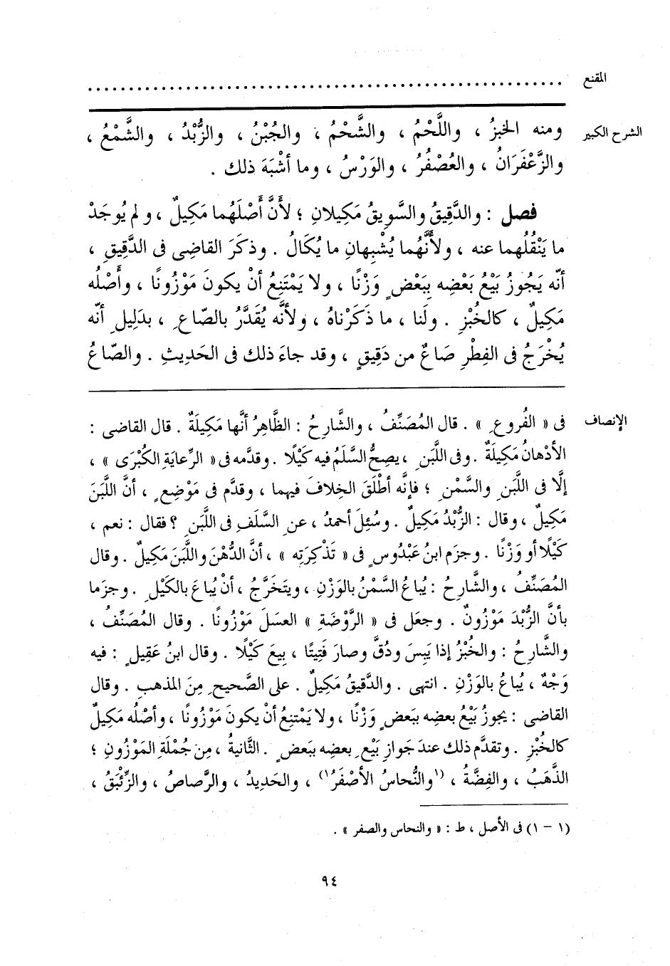 في «الفُروعِ». قال المُصَنِّفُ، والشَّارِحُ: الظَّاهِرُ أنَّها مَكِيلَةٌ. قال القاضي: الأدْهانُ مَكِيلَةٌ. وفي اللَّبَنِ، يصِحُّ السَّلَمُ فيه كَيلًا. وقدَّمه في «الرِّعايَةِ الكُبْرَى»، إلَّا في اللَّبَنِ والسَّمْنِ؛ فإنَّه أطْلَقَ الخِلافَ فيهما، وقدَّم في مَوْضع، أنَّ اللَّبَنَ مَكِيلٌ، وقال: الزُّبْدُ مَكِيلٌ. وسُئِلَ أحمدُ، عنِ السَّلَفِ في اللَّبَنِ؛ فقال: نعم، كَيلًا أو وَزْنًا. وجزَم ابنُ عَبْدُوسٍ في «تَذْكِرَتِه»، أنَّ الدُّهْنَ واللَّبَنَ مَكِيلٌ. وقال المُصَنِّفُ، والشَّارِحُ: يُباعُ السَّمْنُ بالوَزْنِ، ويتَخَرَّجُ، أنْ يُباعَ بالكَيلِ. وجزَ ما بأنَّ الزُّبْدَ مَوْزُونٌ. وجعَل في «الرَّوْضَةِ» العسَلَ مَوْزُونًا. وقال المُصَنِّفُ، والشَّارِحُ: والخُبْزُ إذا يَبِسَ ودُقَّ وصارَ فَتِيتًا، بِيعَ كَيلًا. وقال ابنُ عَقِيلٍ: فيه وَجْهٌ، يُباعُ بالوَزْنِ. انتهى. والدَّقيقُ مَكِيلٌ. على الصَّحيحِ مِنَ المذهبِ. وقال القاضي: يجوزُ بَيعُ بعضِه ببَعضٍ وَزْنًا، ولا يَمْتنِعُ أنْ يكونَ مَوْزُونًا، وأصْلُه مَكِيل كالخُبْزِ. وتقدَّم ذلك عندَ جَوازِ بَيعِ بعضِه ببَعض. الثَّانيةُ، مِن جُمْلَةِ المَوْزُونِ؛ الذَّهَبُ، والفِضَّةُ، [والنُّحاسُ الأصْفَرُ] (¬1)، والحَدِيدُ، والرَّصاصُ، والزِّئْبَقُ،
