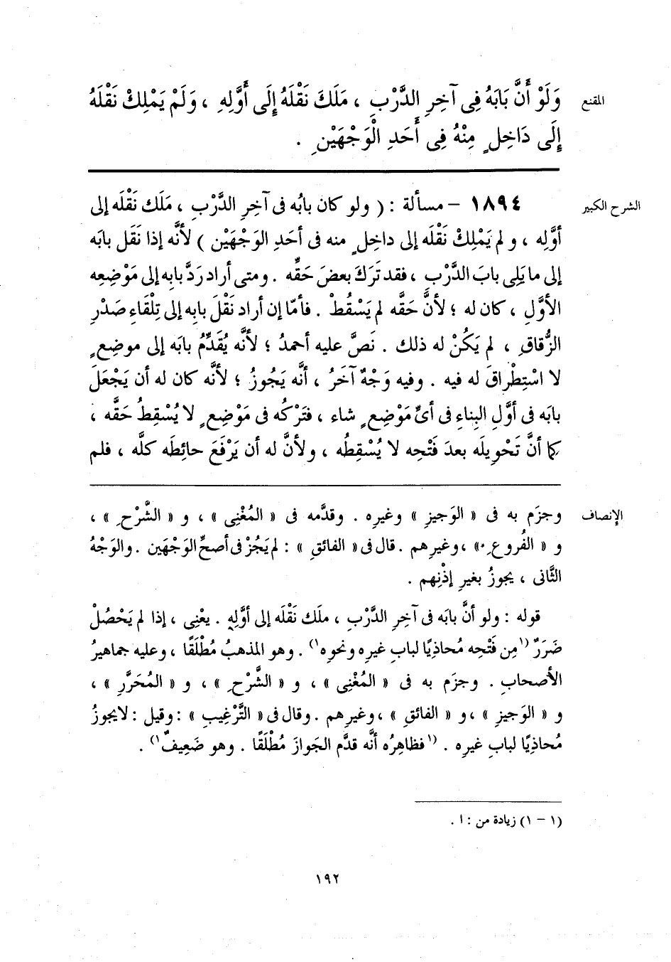 قوله: ولو أنَّ بابَه في آخِرِ الدَّرْبِ، ملَك نَقْلَه إلى أوَّلِه. يعْنِي، إذا لم يَحْصُلْ ضَرَر [مِن فَتْحِه مُحاذِيًا لبابِ غيرِه ونحوه] (¬1). وهو المذهبُ مُطْلَقًا، وعليه جماهيرُ الأصحابِ. وجزَم به في «المُغْنِي»، و «الشرْحِ»، و «المُحَرَّرِ»، و «الوَجيزِ»، و «الفائقِ»، وغيرِهم. وقال في «التَّرْغِيبِ»: وقيل: لا يجوزُ مُحاذِيا لبابِ غيرِه. [فظاهِرُه أنَّه قدم الجَوازَ مُطْلَقًا. وهو ضَعِيف] (1).