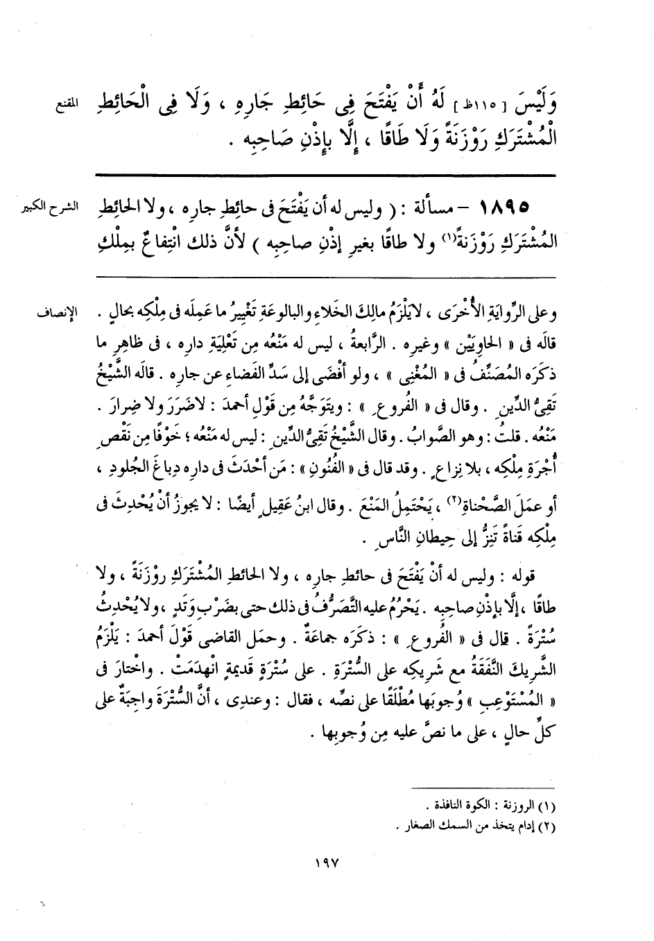 قوله: وليس له أنْ يَفْتَحَ في حائطِ جارِه، ولا الحائطِ المُشْتَرَكِ روْزَنَةً، ولا طاقًا، إلَّا بإذْنِ صاحِبِه. يَحْرُمُ عليه التَّصَرُّفُ في ذلك حتى بضَرْبِ وَتَدٍ، ولا يُحْدِثُ سُتْرَةً. قال في «الفُروعِ»: ذكَرَه جماعَةٌ. وحمَل القاضي قَوْلَ أحمدَ: يَلْزَمُ الشَّرِيكَ النَّفَقَةُ مع شَرِيكِه على السُّتْرَةِ. على سُتْرَةٍ قَديمةٍ انْهدَمَتْ. واخْتارَ في «المُستَوْعِبِ» وُجوبَها مُطْلَقًا على نصِّه، فقال: وعندِي، أن السُّتْرَةَ واجِبَة على كلِّ حالٍ، على ما نصَّ عليه مِن وُجوبِها.