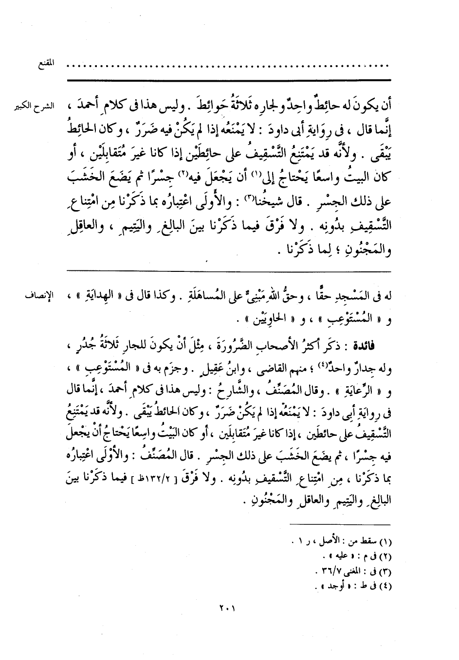 فائدة: ذكَر أكثرُ الأصحابِ الضَّرُورَةَ، مِثْلَ أنْ يكونَ للجارِ ثَلاثَةُ جُدُرٍ، وله جِدارٌ واحدٌ (¬1)؛ منهم القاضي، وابنُ عَقِيلٍ. وجزَم به في «المُسْتَوْعِبِ»، و «الرِّعايَةِ». وقال المُصَنِّفُ، والشَّارِحُ: وليس هذا في كلامِ أحمدَ، إنَّما قال في رِوايَةِ أبِي داودَ: لا يَمْنَعُه إذا لم يَكُنْ ضَرَرٌ، وكان الحائطُ يَبْقَى. ولأنَّه قد يَمْتَنِعُ التَّسْقِيفُ على حائطَين، إذا كانا غيرَ مُتَقابِلَين، أو كان البَيتُ واسِعًا يَحْتاجُ أنْ يجعلَ فيه جِسْرًا، ثم يضَعَ الخَشَبَ على ذلك الجِسْرِ. قال المُصَنِّفُ: والأوْلَى اعْتِبارُه بما ذكَرْنا، مِنِ امْتِناعِ التَّسْقيفِ بدُونِه. ولا فَرْقَ فيما ذكَرْنا بينَ البالِغِ واليَتِيمِ والعاقلِ والمَجْنُونِ.