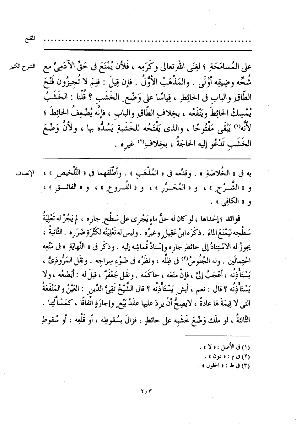 فوائد؛ إحْداها، لو كان له حقُّ ماءٍ يَجْرِي على سَطْحِ جارِه، لم يَجُزْ له تَعْلِيَةُ سَطْحِه ليَمْنَعَ الماءَ. ذكَرَه ابنُ عَقِيلٍ وغيرُه. وليس له تَعْلِيَتُه لكَثْرَةِ ضَرَرِه. الثَّانيةُ، يجوزُ له الاسْتِنادُ إلى حائطِ جارِه وإسْنادُ قُماشِه إليه. وذكَر في «النِّهايَةِ» في مَنْعِه احْتِمالين. وله الجُلُوسُ (¬1) في ظِلِّه، ونظَرُه في ضَوْءِ سِراجِه. ونقَل المَرُّوذِيُّ، يَسْتَأْذِنُه، أعْجَبُ إليَّ، فإنْ منَعَه، حاكَمَه. ونقَل جَعْفَرٌ، قيلَ له: أيَضَعُه، ولا يَسْتَأْذِنُه؟ قال: نعم، أيشِ يَسْتَأْذِنُه؟ قال الشيخُ تَقِيُّ الدِّينِ: العَينُ والمَنْفَعَةُ التي لا قِيمَةَ لها عادةً، لا يصِحُّ أنْ يرِدَ عليها عقَدُ بَيعٍ وإجارَةٍ اتِّفاقًا، كمَسْأَلتِنا. الثَّالثةُ، لو ملَك وَضْعَ خَشَبِه على حائطٍ، فزال بسُقوطِه، أو قَلْعِه، أو سُقوطِ