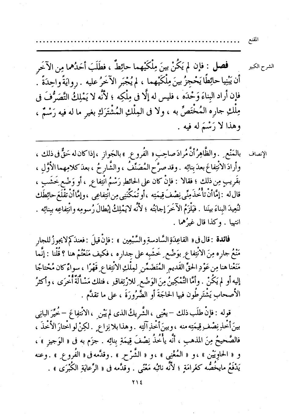 بالمَنْعِ. والظَّاهِرُ أنَّ مُرادَ صاحِبِ «الفُروعِ» بالجَوازِ، إذا كان له حَقٌّ في ذلك، وأرادَ الانْتِفاعَ بعدَ بِنائِه. وقد صرَّح المُصَنِّفُ، والشَّارِحُ، بعد كلامِهما الأوَّلِ، بقَرِيبٍ مِن ذلك؛ فقالا: فإنْ كان على الحائطِ رَسْمُ انْتِفاعٍ، أو وَضْع خَشَب، قال له: إمَّا أنْ تأْخُذَ مِنِّي نِصْفَ قِيمَتِه، أو تُمَكِّنَنِي مِن انْتِفاعِي، وإمَّا أنْ تقلَعَ حائِطَك لنُعِيدَ البِناءَ بينَنا. فيَلْزَمُ الآخَرَ إجابَتُه؛ لأنَّه لا يمْلِكُ إبْطال رُسومِه وانْتِفاعِه ببِنائِه. انتهيا. وكذا قال غيرُهما.