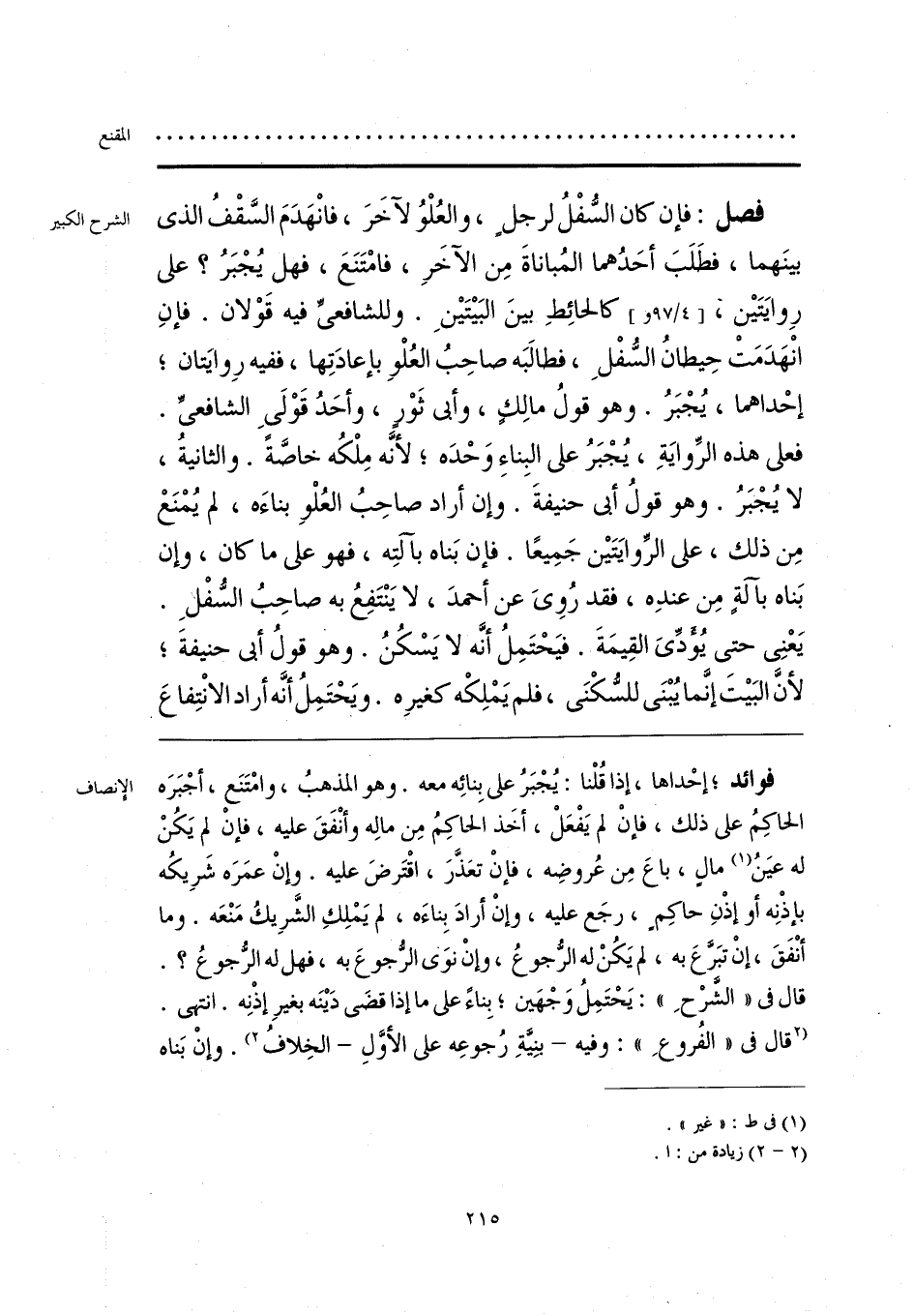 فوائد؛ إحْداها، إذا قُلْنا: يُجْبَرُ على بِنائِه معه. وهو المذهبُ، وامْتَنَع، أجْبَرَه الحاكِمُ على ذلك، فإنْ لم يَفْعَلْ، أخَذ الحاكِمُ مِن مالِه وأنْفَقَ عليه، فإنْ لم يَكُنْ له عيَنُ (¬1) مالٍ، باعَ مِن عُروضِه، فإنْ تعَذَّرَ، اقْتَرضَ عليه. وإنْ عمَرَه شَرِيكُه بإذْنِه أو إذْنِ حاكِمٍ، رجَع عليه، وإنْ أرادَ بِناءَه، لم يَمْلِكِ الشَّرِيكُ مَنْعَه. وما أنْفَقَ، إنْ تبَرَّعَ به، لم يَكُنْ له الرُّجوعُ، وإنْ نوَى الرُّجوعَ به، فهل له الرُّجوعُ؟. قال في «الشرْحِ»: يَحْتَمِلُ وَجْهَين؛ بِناءً على ما إذا قضَى دَينَه بغيرِ إذْنِه. انتهى. [قال في «الفُروعِ»: وفيه -بنِيَّةِ رُجوعِه على الأوَّلِ- الخِلافُ] (¬2). وإنْ بَناه