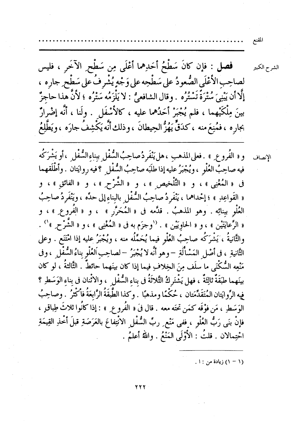 و «الفُروعِ». فعلى المذهبِ، هل يَنْفَرِدُ صاحِبُ السُّفْلِ ببِناءِ السُّفْلِ، أو يَشْرَكُه فيه صاحِبُ العُلْو، ويُجْبَرُ عليه إذا طلَبَه صاحِبُ السُّفْلِ؟ فيه رِوايَتان. وأطْلَقهما في «المُغْنِي»، و «التَّلْخيصِ»، و «الشَّرْحِ»، و «الفائقِ»، و «القَواعِدِ»؛ إحْداهما، يَنْفَرِدُ صاحِبُ السُّفْلِ بالبِناءِ إلى حدِّه، ويَنْفَرِدُ صاحِبُ العُلْو ببِنائِه. وهو المذهبُ. قدَّمه في «المُحَرَّرِ»، و «الفُروعِ»، و «الرعايَتَين»، و «الحاويَيْن». [وجزَم به في «المُغْنِي»، و «الشّرْحِ»] (¬1). والثَّانيةُ، يَشْرَكُه صاحِبُ العُلْو فيما يُحَمِّلُه منه، ويُجْبَرُ عليه إذا امْتَنَع. وعلى الثَّانيةِ، في أصْلِ المَسْأْلَةِ -وهو أنَّه لا يُجْبَرُ- لصاحِبِ العُلْو بِناءُ السُّفْلِ، وفي مَنْعِه السُّكْنَى ما سلَف مِنَ الخِلافِ فيما إذا كان بينَهما حائطٌ. الثَّالثةُ، لو كان بينَهما طبَقَةٌ ثالِثَةٌ، فهل يَشْتَرِكُ الثَّلاثةُ في بِناءِ السُّفْلِ، والاثْنان في بِناءِ الوَسَطِ؟ فيه الروايَتان المُتَقَدِّمَتان، حُكْمًا ومذهبًا. وكذا الطَّبقَةُ الرَّابِعَةُ فأكْثرُ. وصاحِبُ الوَسَطِ، مَن فوْقَه كمَن تحتَه معه. قال فىَ «الفُروعِ»: إذا كانُوا ثلاثَ طِباقٍ، فإنْ بنَى رَبُّ العُلْو، ففي مَنْعِ ربِّ السُّفْلِ الانْتِفاعَ بالعَرَصَةِ قبلَ أخْذِ القِيمَةِ احْتِمالان. قلتُ: الأوْلَى المَنْعُ. واللهُ أعلمُ.