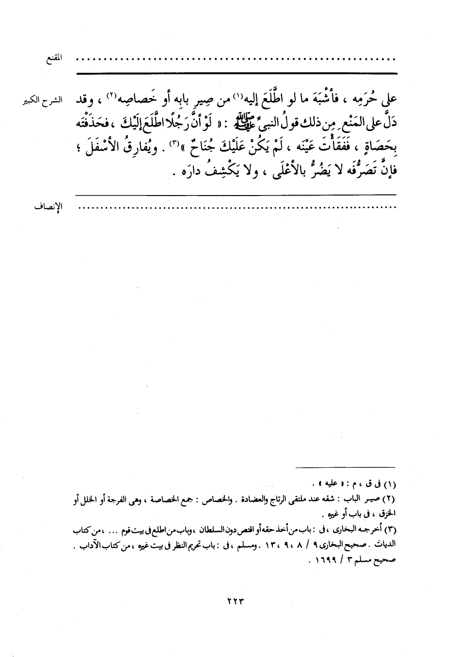 (¬3) أخرجه البخاري، في: باب من أخذ حقه أو اقتص دون السلطان، وباب من اطلع في بيت قوم. . . .، من كتاب الديات. صحيح البخاري 9/ 8، 9، 13. ومسلم، في: باب تحريم النظر في بيت غيره، من كتاب الآداب. صحيح مسلم 3/ 1699.