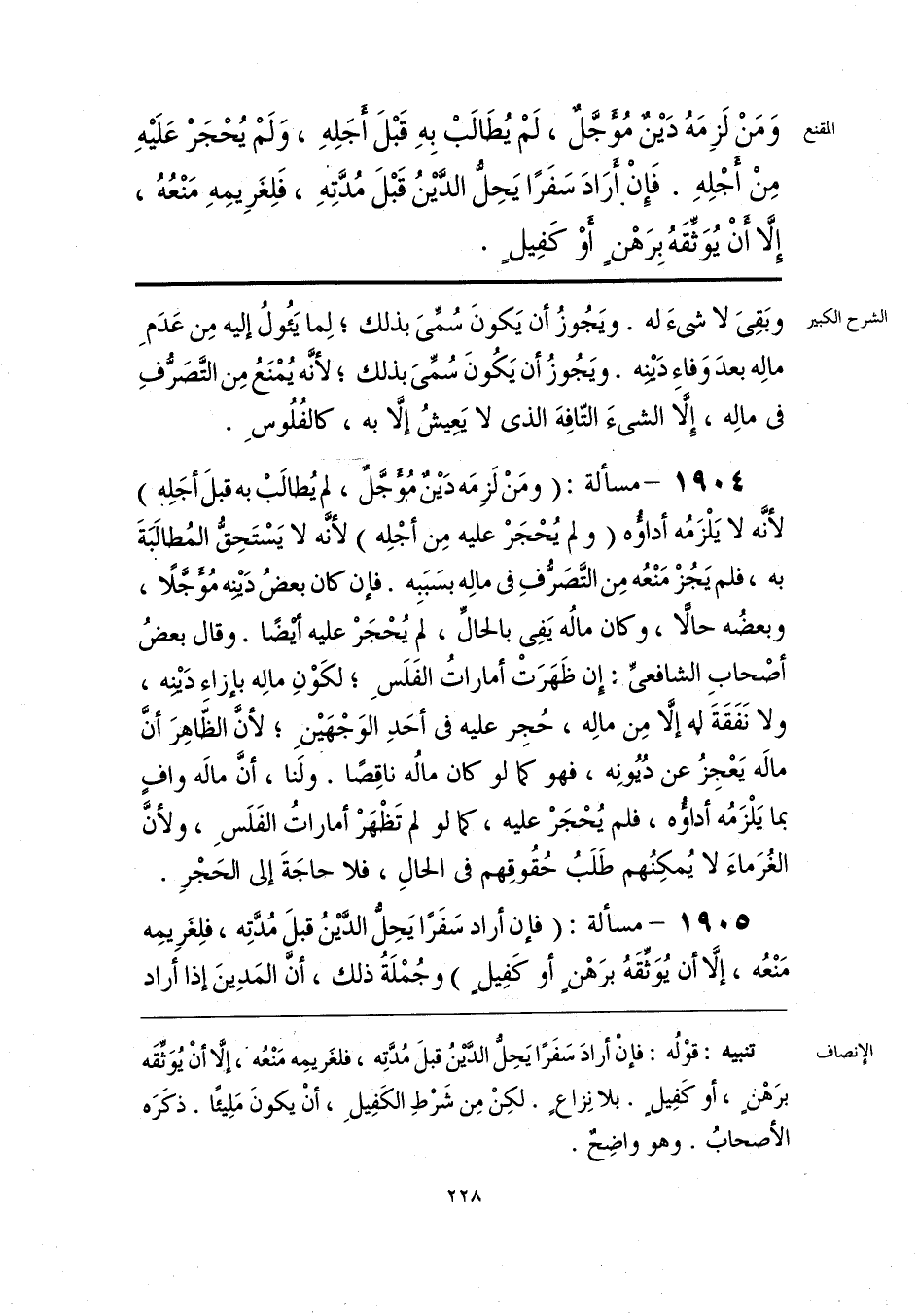 وَمَنْ لَزِمَهُ دَينٌ مُؤجَّلٌ، لَمْ يُطَالبْ بِهِ قَبْلَ أجَلِهِ، وَلَمْ يُحْجَرْ عَلَيهِ مِنْ أجْلِهِ. فَإِنْ أرَادَ سَفَرًا يَحِلُّ الدَّينُ قَبْلَ مُدَّتِهِ، فَلِغَرِيمِهِ مَنْعُهُ، إلا أَنْ يُوَثِّقَهُ بِرَهْنٍ أوْ كَفِيلٍ.