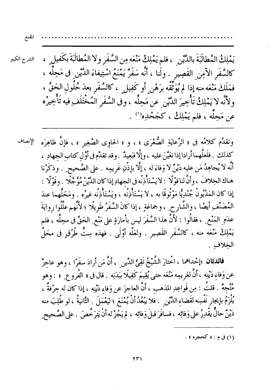 وتقدَّم كلامُه في «الرِّعايَةِ الصُّغْرَى»، و «الحاوي الصَّغِيرِ»، فإنَّ ظاهِرَه كذلك. فلَعلَّهما أرادا إذا تعَيَّنَ عليه، وإلَّا فبَعِيدٌ. وقد تقدَّم في أوَّلِ كتابِ الجِهادِ، أنَّه لا يُجاهِدُ مَن عليه دَينٌ لا وَفاءَ له، إلَّا بإذْنِ غَرِيمِه. على الصَّحيحِ. وذكَرْنا هناك الخِلافَ، وأنَّ لنا قوْلًا: لا يَسْتَأْذِنُه في الجِهادِ إذا كان الدَّينُ مُؤجَّلًا. وقَوْلًا: إذا كان المَدْيُونُ جُنْدِيًّا مَوْثُوقًا به، لا يَسْتَأذِنُه، ويَسْتَأذِنُه غيرُه. ومَحَلُّهما عندَ المُصَنِّفِ أيضًا، والشَّارِحِ، وجماعَةٍ، إذا كانَ السَّفَرُ طَويلًا؛ لأنَّهم علَّلُوا رِوايَةَ عدَمِ المَنْعِ، فقالُوا: لأنَّ هذا السَّفَرَ ليس بأمارَةٍ على مَنْعِ الحَقِّ في محِلِّه، فلم يَمْلِكْ مَنْعَه منه، كالسَّفَرِ القَصِيرِ. ولعَلَّه أوْلَى. فهذه سِتُّ طُرُقٍ في محَلِّ الخِلافِ.