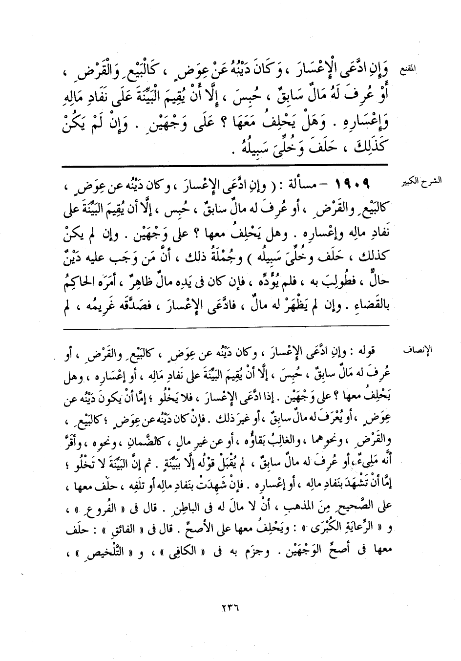 قوله: وإنِ ادَّعَى الإِعْسارَ، وكان دَينُه عن عِوَضٍ، كالبَيعِ والقَرْضِ، أو عُرِفَ له مَالٌ سابِقٌ، حُبِسَ، إلَّا أنْ يُقِيمَ البَيَّنَةَ على نَفادِ مَالِه، أو إعْسَارِه، وهل يَحْلِفُ معها؟ على وَجْهَين. إذا ادَّعَى الإعْسارَ، فلا يَخْلُو؛ إمَّا أنْ يكونَ دَينُه عن عِوَضٍ، أو يُعْرَفَ له مالٌ سابِقٌ، أو غيرَ ذلك. فإنْ كان دَينُه عن عِوَضٍ؛ كالبَيعِ، والقَرْضِ، ونحوهما، والغالِبُ بَقاؤُه، أو عن غيرِ مالٍ، كالضَّمانِ، ونحوه، وأقَرَّ أنَّه مَلِئٌ، أو عُرِفَ له مالٌ سابِقٌ، لم يُقْبَلْ قوْلُه إلا ببَيِّنَةٍ. ثم إن البَيِّنَةَ. لا تَخْلُو؛ إمَّا أنْ تَشْهَدَ بنَفادِ مالِه، أو إعْسارِه. فإنْ شَهِدَتْ بنَفادِ مالِه أو تنفِه، حلف معها، على الصَّحيحِ مِنَ المذهبِ، أنْ لا مال له في الباطِنِ. قال في «الفُروعِ»، و «الرِّعايَةِ الكُبْرَى»: ويَحْلِفُ معها على الأصحِّ. قال في «الفائقِ»: حلَف معها في أصحِّ الوَجْهَين. وجزَم به في «الكافِي»، و «التَّلْخيصِ»،