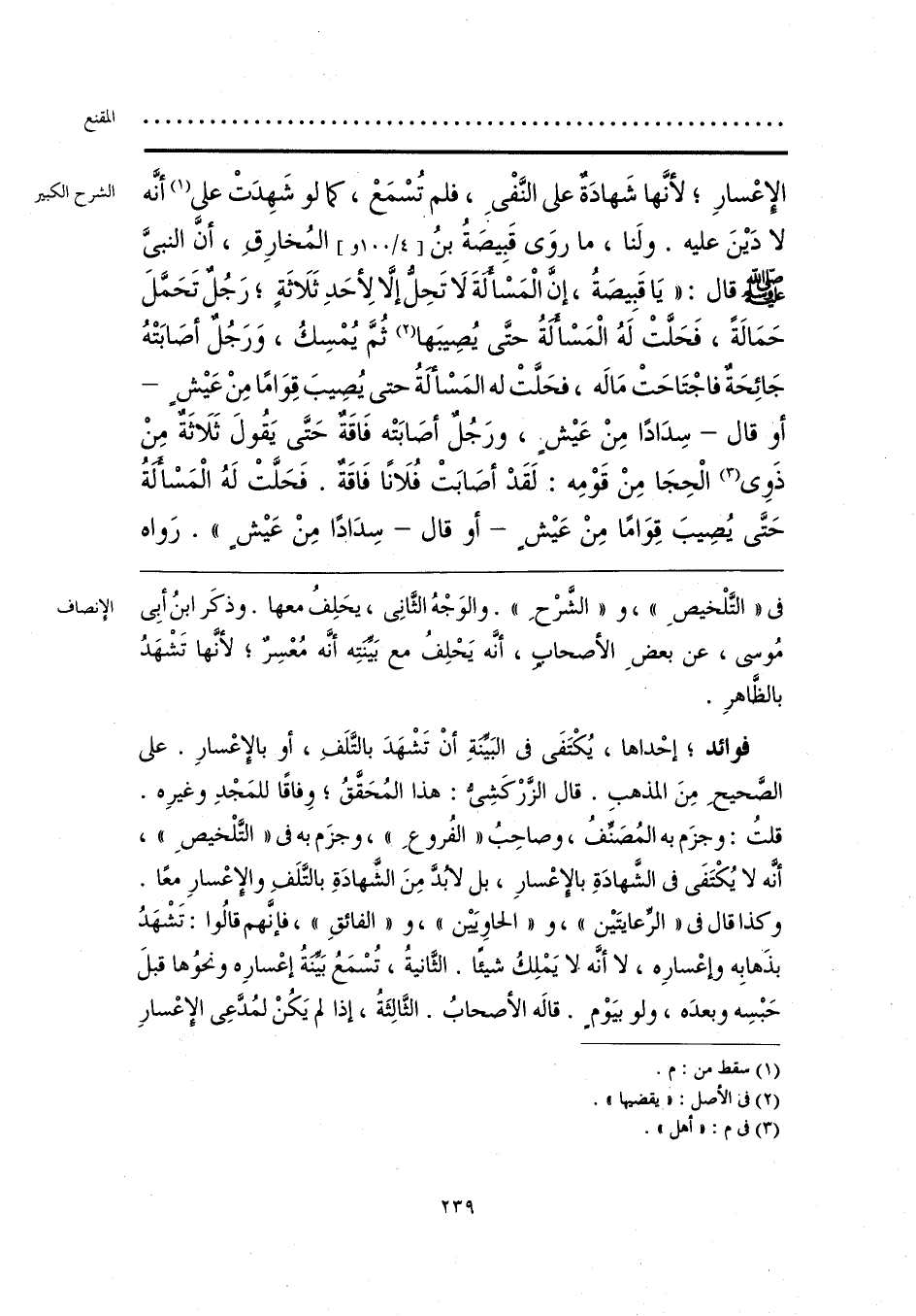 فوائد؛ إحْداها، يُكْتَفَى في البَيِّنةِ أنْ تَشْهَدَ بالتَّلَفِ، أو بالإِعْسارِ. على الصَّحيحِ مِنَ المذهبِ. قال الزَّرْكَشِيُّ: هذا المُحَقَّقُ؛ وفاقًا للمَجْدِ وغيرِه. قلتُ: وجزَم به المُصَنِّفُ، وصاحِبُ «الفُروعِ»، وجزَم به في «التَّلْخيصِ»، أنه لا يُكْتَفَى في الشَّهادَةِ بالإِعْسارِ، بل لا بدَّ مِنَ الشهادَةِ بالتَّلَفِ والإِعْسارِ معًا. وكذا قال في «الرِّعايتَين»، و «الحاويَيْن»، و «الفائقِ»، فإنَّهم قالُوا: تَشْهَدُ بذَهابِه وإعْسارِه، لا أنَّه لا يَمْلِكُ شيئًا. الثَّانيةُ، تُسْمَعُ بَينةُ إعْسارِه ونحوُها قبلَ حَبْسِه وبعدَه، ولو بيَوْمٍ. قاله الأصحابُ. الثَّالِثَةُ، إذا لم يَكُنْ لمُدَّعِي الإِعْسارِ