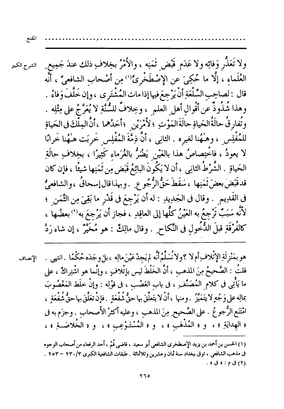 هو بمَنْزِلَةِ الإِتْلافِ أم لا؟ ولا نُسَلِّمُ أنَّه لم يَجِدْ عَينَ مالِه، بل وجَدَه حُكْمًا. انتهى. قلتُ: الصَّحيحُ مِنَ المذهبِ، أنَّ الخَلْطَ ليس بإتْلافٍ، وإنَّما هو اشْتِراكٌ، على ما يَأْتِي في كلامِ المُصَنِّفِ، في بابِ الغَصْبِ، في قوْلِه: وإنْ خلَط المَغْصُوبَ بمالِه على وَجْهٍ لا يتَمَيَّزُ. ومنها، أنْ لا يتَعلَّقَ بها حقُّ شُفْعَةٍ. فإنْ تعَلَّقَ بها حقُّ شُفْعَةٍ، امْتَنَع الرُّجوعُ. على الصَّحيحِ مِنَ المذهبِ، وعليه أكثرُ الأصحابِ. وجزَم به في «الهِدايَةِ»، و «المُذْهَبِ»، و «المُسْتَوْعِب»، و «الخُلاصَةِ»،