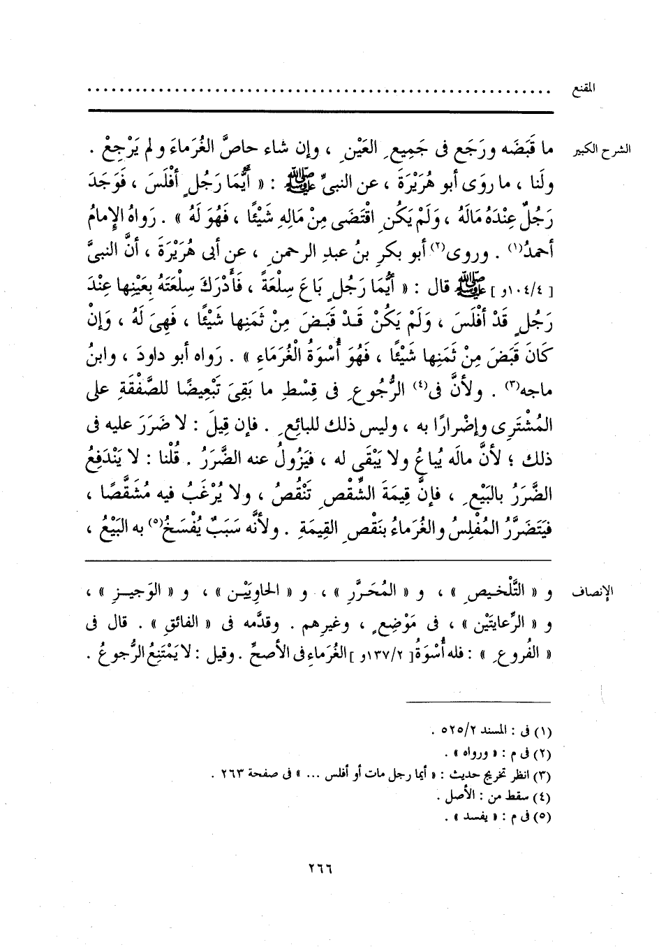 و «التَّلْخيصِ»، و «المُحَرَّرِ»، و «الحاويَيْن»، و «الوَجيزِ»، و «الرِّعايتَين»، في مَوْضِعٍ، وغيرِهم. وقدَّمه في «الفائقِ». قال في «الفُروعِ»: فله أُسْوَةُ الغُرَماءِ في الأصحِّ. وقيل: لا يَمْتَنِعُ الرُّجوعُ.