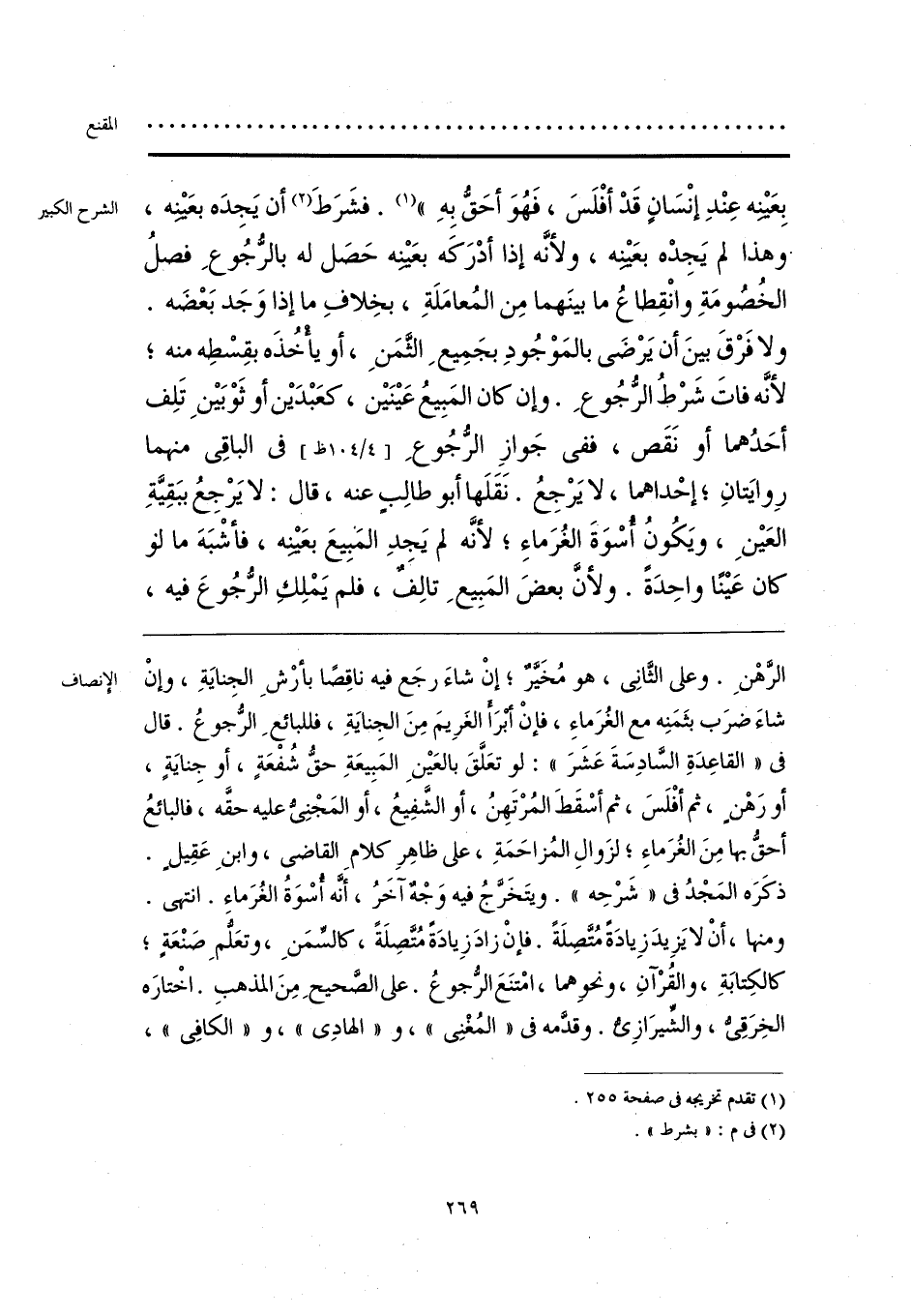 الرَّهْنِ. وعلى الثَّانِي، هو مُخَيَّرٌ؛ إنْ شاءَ رجَع فيه ناقِصًا بأرْشِ الجِنايَةِ، وإنْ شاءَ ضرَب بثَمَنِه مع الغُرَماءِ، فإنْ أَبرَأ الغَرِيمَ مِنَ الجِنايَةِ، فللبائعِ الرُّجوعُ. قال في «القاعِدَةِ السَّادِسَةَ عَشَرَ»: لو تعَلَّقَ بالعَينِ المَبِيعَةِ حقُّ شُفْعَةٍ، أو جِنايَةٍ، أو رَهْن، ثم أفْلَسَ، ثم أسْقَطَ المُرْتَهِنُ، أو الشَّفِيعُ، أو المَجْنِيُّ عليه حقَّه، فالبائعُ أحقُّ بها مِنَ الغُرَماءِ؛ لزَوالِ المُزاحَمَةِ، على ظاهِرِ كلام القاضي، وابنِ عَقِيل. ذكَرَه المَجْدُ في «شَرْحِه». ويتَخَرَّجُ فيه وَجْهٌ آخَرُ، أَنَّه أُسْوَةُ الغُرَماء. انتهى. ومنها، أنْ لا يَزِيدَ زِيادَةً مُتَّصِلَةً. فإنْ زادَ زِيادَةً مُتَّصِلَةً، كالسِّمَنِ، وتعَلُّمِ صَنْعَةٍ؛ كالكِتابَةِ، والقُرْآنِ، ونحوهما، امْتنَعَ الرُّجوعُ. على الصَّحيحِ مِنَ المذهبِ. اخْتارَه الخِرَقِيُّ، والشِّيرَازِيُّ. وقدَّمه في «المُغْنِي»، و «الهادِي»، و «الكافِي»،