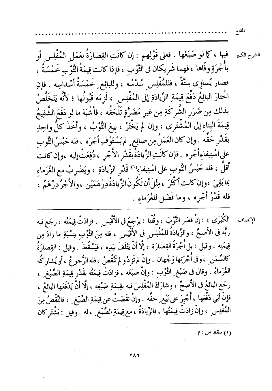 الكُبْرَى»: إنْ قصَر الثَّوْبَ، وقُلْنا: يرْجِعُ في الأقْيَسِ. فزادَتْ قِيمَتُه، رجَع فيه ربُّه في الأصحِّ، والزِّيادَةُ للمُفْلِسِ في الأقْيَسِ، فله مِنَ الثَّوْبِ بِنِسْبَةِ ما زادَ مِن قِيمَتِه. وقيل: بل أُجْرَةُ القِصارَةِ، إلَّا أنْ يَتْلَفَ بيَدِه، فيَسْقُطَ. وقيل: القِصارَةُ كالسِّمَنِ، وفي أُجْرَتِها وَجْهان. وإنْ لم تَزِدْ ولم تَنْقُصْ، فله الرُّجوعُ، أو يُشارِكُه الغُرَماءُ. وقال في صَبْغِ الثَّوْبِ: وإنْ صبَغَه، فزادَتْ قِيمَتُه بقَدْرِ قِيمَةِ الصِّبْغِ، رجَع البائعُ في الأصحِّ، وشارَكَ المُفلِسَ فيه بقِيمَةِ صَبْغِه، إلَّا أنْ يَدْفَعَها البائعُ، فإنْ أَبَى دَفْعَها، أُجْبِرَ على بَيعِ حقِّه. وإنْ نقَصَتْ عن قِيمَةِ الصِّبْغِ؛ فالنَّقْصُ مِنَ المُفْلِسِ، وإنْ زادَتْ قِيمَتُها، فالزِّيادَةُ، مع قِيمَةِ الصِّبْغِ، له. وقيل: يَشْتَرِكان