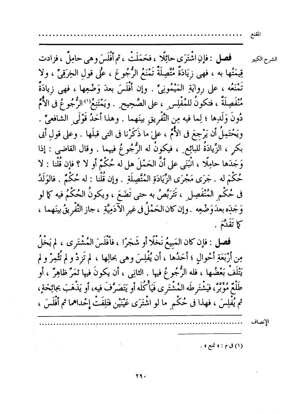 فصل: فإنِ اشْتَرَى حائِلًا، فحَمَلَتْ، ثم أفْلَسَ وهي حامِل، فزادت قِيمَتُها به، فهي زِيَادَة مُتَّصِلَة تَمْنَعُ الرُّجُوعَ، على قولِ الخِرَقِيِّ، ولا تَمْنَعُه، على رِوايَةِ المَيمُونِيِّ. وإن أفْلَسَ بعدَ وَضْعِها، فهي زِيادَة مُنْفَصِلَة، فتكونُ للمُفْلِسِ، على الصَّحِيحِ. ويَمْتَنِعُ (¬1) الرُّجُوعُ في الأم دُونَ وَلَدِها، لِما فيه مِن التَّفْرِيقِ بينَهما. وهذا أحَدُ قَوْلَي الشافعيِّ. ويَحْتَمِلُ أن يَرْجِعَ في الأمِّ، على ما ذَكَرْنا في التي قبلَها. وعلى قولِ أبي بكرٍ، الزِّيادَةُ للبائِعِ، فيكون له الرُّجُوعُ فيهما. وقال القاضي: إذا وَجَدَها حامِلًا، انْبَنَى على أنَّ الحَمْلَ هل له حُكْمٌ أو لا؟ فإن قُلْنا: لا حُكْمَ له. جَرَى مَجْرَى الزِّيَادَةِ المُتَّصِلَةِ. وإن قُلْنا: له حُكْمٌ. فالوَلَدُ في حُكْمِ المُنْفَصِلِ، تَتَرَبَّصُ به حتَّى تَضَعَ، ويكونُ الحُكْمُ فيه كما لو وَجَده بعدَ وَضْعِه. وإن كان الحَمْلُ في غيرِ الآدَمِيَّةِ، جاز التَّفْرِيقُ بينَهما، كما تَقَدَّمَ.
