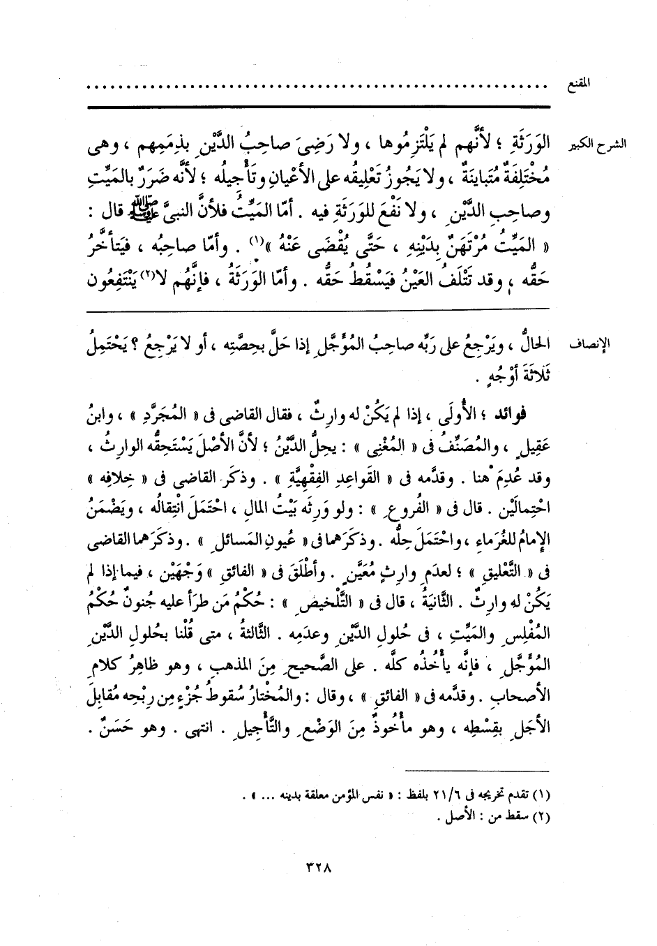 الحالُّ، ويَرْجِعُ على رَبِّه صاحِبُ المُؤجَّلِ إذا حَلَّ بحِصَّتِه، أو لا يَرْجِعُ؟ يَحْتَمِلُ ثَلاثَةَ أوْجُهٍ. فوائد؛ الأولَى، إذا لم يَكُنْ له وارِثٌ، فقال القاضي في «المُجَرد»، وابنُ عَقِيلٍ، والمُصَنِّفُ في «المُغْنِي»: يحِلُّ الدَّينُ؛ لأنَّ الأصْلَ يَسْتَحِقُّه الوارِثُ، وقد عُدِمَ هنا. وقدَّمه في «القَواعِدِ الفِقْهِيَّةِ». وذكَر القاضي في «خِلافِه» احْتِمالين. قال في «الفُروعِ»: ولو وَرِثَه بَيتُ المالِ، احْتَمَلَ انْتِقالُه، ويَضْمَنُ الإمامُ للغُرَماءِ، واحْتَمَلَ حِلُّه. وذكَرَهما في «عُيونِ المَسائلِ». وذكَرَهما القاضي في «التَّعْليقِ»؛ لعدَمِ وارِثٍ مُعَيَّنٍ. وأطْلَقَ في «الفائقِ» وَجْهَين، فيما إذا لم يَكُنْ له وارِثٌ. الثَّانيَةُ، قال في «التَّلْخيصِ»: حُكْمُ مَن طرَأ عليه جُنونٌ حُكْمُ المُفْلِسِ والمَيِّتِ، في حُلولِ الدَّينِ وعدَمِه. الثَّالثةُ، متى قُلْنا بحُلولِ الدَّينِ المُؤجَّلِ، فإنَّه يأْخُذُه كلَّه. على الصَّحيحِ مِنَ المذهبِ، وهو ظاهِرُ كلامِ الأصحابِ. وقدَّمه في «الفائقِ»، وقال: والمُخْتارُ سُقوطُ جُزْء مِن رِبْحِه مُقابِلَ الأجَلِ بقِسْطِه، وهو مأْخُوذ مِنَ الوَضْعِ والتَّأْجِيلِ. انتهى. وهو حَسَنٌ.