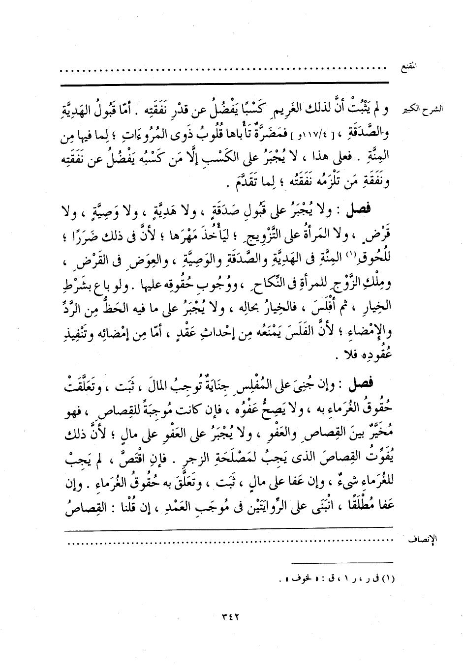 فصل: ولا يُجْبَرُ على قَبُولِ صَدَقَةٍ، ولا هَدِيَّةٍ، ولا وَصِيَّةٍ، ولا قَرْضٍ، ولا المَرأةُ على التَّزْويجَ؛ ليَأْخُذَ مَهْرَها؛ لأنَّ في ذلك ضَرَرًا؛ للُحُوقِ (¬1) المِنَّةِ في الهَدِيَّةِ والصَّدَقَةِ والوَصِيَّةِ، والعِوَضِ في القَرْضِ، ومِلْكِ الزَّوْجِ للمرأةِ في النِّكاحِ، ووُجُوبِ حُقُوقِه عليها. ولو باع بشَرْطِ الخِيارِ، ثم أفْلَسَ، فالخِيارُ بحالِه، ولا يُجْبَرُ على ما فيه الحَظُّ مِن الرَّدِّ والإِمْضاءِ؛ لأنَّ الفَلَسَ يَمْنَعُه مِن إحْداثِ عَقْدٍ، أمّا مِن إمْضائِه وتَنْفِيذِ عُقُودِه فلا.