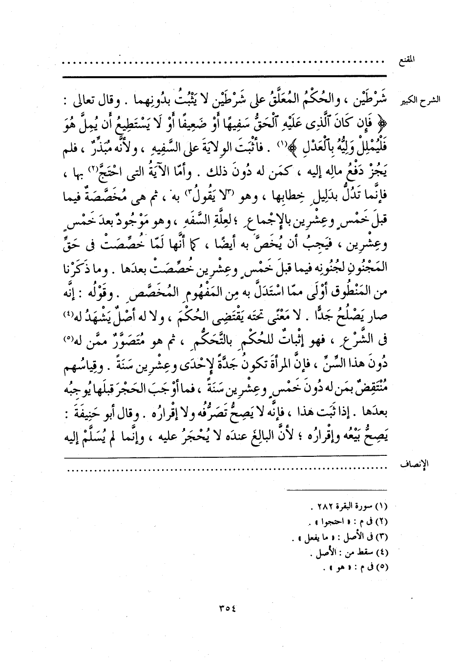 شَرْطَين، والحُكْمُ المُعَلَّقُ على شَرْطَين لا يَثْبُتُ بدُونِهما. وقال تعالى: {فَإِنْ كَانَ الَّذِي عَلَيهِ الْحَقُّ سَفِيهًا أَوْ ضَعِيفًا أَوْ لَا يَسْتَطِيعُ أَنْ يُمِلَّ هُوَ فَلْيُمْلِلْ وَلِيُّهُ بِالْعَدْلِ} (¬1). فأثْبَتَ الولايةَ على السَّفِيهِ، ولأنَّه مُبَذِّرٌ، فلم يَجُزْ دَفْعُ مالِه إليه، كمَن له دُونَ ذلك. وأمّا الآيَةُ التي احْتَجَّ (¬2) بها، فإنَّما تَدُلُّ بدَلِيلِ خِطابِها، وهو [لا يَقولُ] (¬3) به، ثم هي مُخَصَّصَةٌ فيما قبلَ خَمْسٍ وعِشْرِين بالإجْماعِ؛ لعِلَّةِ السَّفَهِ، وهو مَوْجُود بعدَ خَمْسٍ وعِشْرِين، فيَجِبُ أن يُخَصَّ به أيضًا،؛ أنَّها لَمّا خُصِّصَتْ في حَقِّ المَجْنُونِ لجُنُونِه فيما قبلَ خَمْسٍ وعِشْرِين خُصِّصَتْ بعدَها. وما ذَكَرْنا من المَنْطُوق أوْلَى ممّا اسْتَدَلَّ به مِن المَفْهُومِ المُخَصَّصِ. وقَوْلُه: إنَّه صار يَصْلُحُ جَدًّا لا مَعْنًى تحتَه يَقْتَضِي الحُكْمَ، ولا له أصْلٌ يَشْهَدُ له (¬4) في الشَّرْعِ، فهو إثْباتٌ للحُكْمِ بالتَّحَكُّمِ، ثم هو مُتَصَوَّرٌ ممَّن له (¬5) دُونَ هذا السِّنِّ، فإنَّ المرأةَ تكونُ جَدَّةً لإِحْدَى وعِشْرِين سَنَةً. وقِياسُهم مُنْتَقِضٌ بمَن له دُونَ خَمْسٍ وعِشْرِين سَنَةً، فما أوْجَبَ الحَجْرَ قبلَها يُوجِبُه بعدَها. إذا ثَبَت هذا، فإَّنه لا يَصِحُّ تَصَرُّفُه ولا إقْرارُه. وقال أبو حَنِيفَةَ: يَصِحُّ بَيعُه وإقْرارُه؛ لأنَّ البالِغَ عندَه لا يُحْجَرُ عليه، وإنَّما لم يُسَلَّمْ إليه
