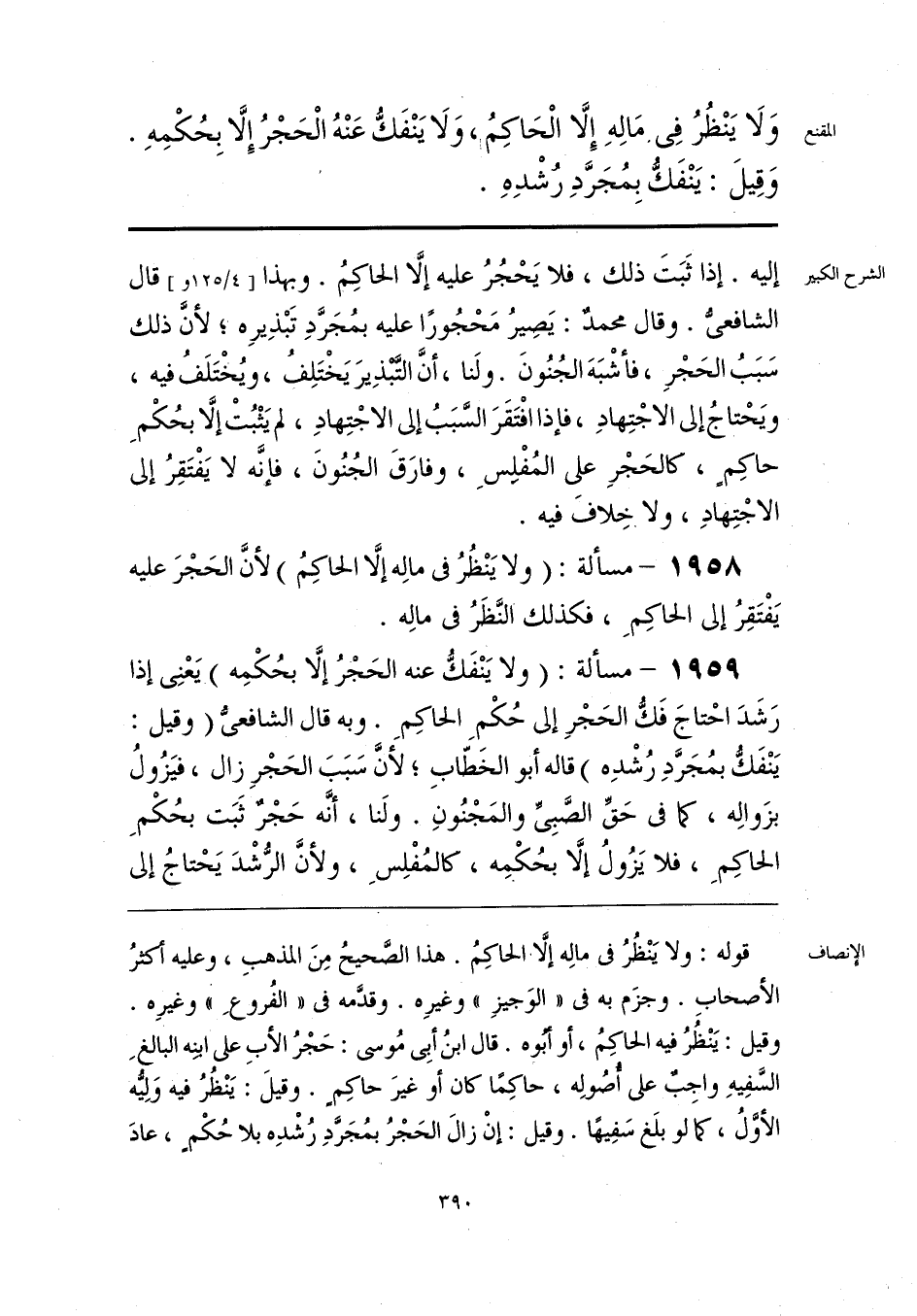 قوله: ولا يَنْظُرُ في مالِه إلَّا الحاكِمُ. هذا الصَّحيحُ مِنَ المذهبِ، وعليه أكثرُ الأصحابِ. وجزَم به في «الوَجيزِ» وغيرِه. وقدَّمه في «الفُروعِ» وغيرِه. وقيل: يَنْظُرُ فيه الحاكِمُ، أو أبُوه. قال ابنُ أبِي مُوسى: حَجْرُ الأبِ على ابنِه البالغِ السَّفِيهِ واجِبٌ على أُصُولِه، حاكِمًا كان أو غيرَ حاكِمٍ. وقيلَ: يَنْظُرُ فيه وَلِيُّه الأوَّلُ، كما لو بلَغ سَفِيهًا. وقيل: إنْ زال الحَجْرُ بمُجَرَّدِ رُشْدِه بلا حُكْمٍ، عادَ