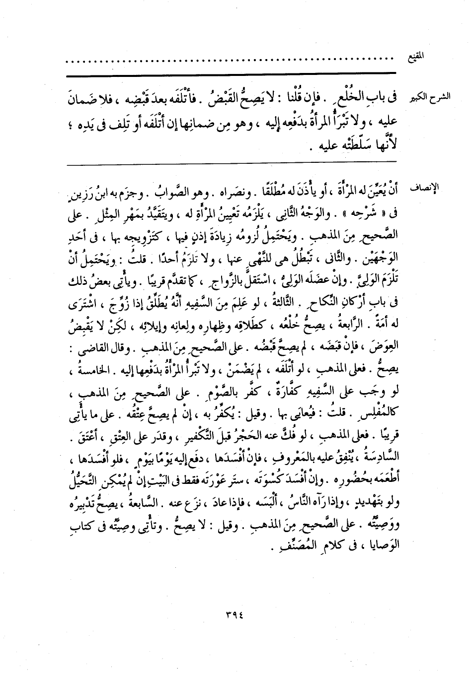 أنْ يُعَيِّنَ له المرْأةَ، أو يأْذَنَ له مُطْلَقًا. ونصَراه. وهو الصَّوابُ. وجزَم به ابنُ رَزِينٍ في «شَرْحِه». والوَجْهُ الثَّانِي، يَلْزَمُه تَعْيِينُ المرْأَةِ له، ويتَقَيَّدُ بمَهْرِ المِثْلِ. على الصَّحيحِ مِنَ المذهبِ. ويَحْتَمِلُ لُزومُه زِيادَةَ إذنٍ فيها، كتَزْويجِه بها، في أحَدِ الوَجْهَين. والثَّاني، تَبْطُلُ هي للنَّهْي عنها، ولا تَلزَمُ أحدًا. قلتُ: ويَحْتَمِلُ أنْ تَلْزَمَ الوَلِيَّ. وإنْ عضَلَه الوَلِيُّ، اسْتَقلَّ بالزَّواجِ، كما تقدَّم قريبًا. ويأْتِي بعضُ ذلك في بابِ أرْكانِ النِّكاحِ. الثَّالثةُ، لو عَلِمَ مِنَ السَّفِيهِ أنَّهُ يُطَلِّقُ إذا زُوِّجَ، اشْتَرَى له أمَةً. الرَّابعةُ، يصِحُّ خُلْعُه، كطَلاقِه وظِهارِه ولِعانِه وإيلائِه، لكِنْ لا يَقْبِضُ العِوَضَ، فإنْ قبَضَه، لم يصِحَّ قَبْضُه. على الصَّحيحِ مِنَ المذهبِ. وقال القاضي: يصِحُّ. فعلى المذهبِ، لو أتْلَفَه، لم يَضْمَنْ، ولا تَبْرأُ المرْأةُ بدَفْعِها إليه. الخامسةُ، لو وجَب على السَّفِيهِ كفارَةٌ، كفَّر بالصَّوْمِ. على الصَّحيحِ مِنَ المذهب، كالمُفْلِسِ. قلتُ: فيُعايَى بها. وقيل: يُكفِّرُ به، إنْ لم يصِحَّ عِتْقُه. على ما يأْتِي قرِيبُا. فعلى المذهبِ، لو فُكَّ عنه الحَجْرُ قبلَ التَّكْفيرِ، وقدَر على العِتْقِ، أعْتَقَ. السَّادِسَةُ، ينفِقُ عليه بالمَعْروفِ، فإنْ أفْسَدَها، دفَع إليه يَوْمًا بيَوْم، فلو أفْسَدَها، أطْعَمَه بحُضُورِه. وإنْ أفْسَدَ كُسْوَتَه، ستَر عَوْرَتَه فقط في البَيتِ إنْ لم يُمْكِنِ التَّحَيُّلُ ولو بتَهْديدٍ، وإِذا رَآه النَّاسُ، ألْبَسَه، فإذا عادَ، نزَع عنه. السَّابعةُ، يصِحُّ تَدْبِيرُه ووَصِيَّتُه. على الصَّحيحِ مِنَ المذهبِ. وقيل: لا يصِحُّ. وتأْتِي وصِيَّتُه في كتاب الوَصايا، في كلامَ المُصَنِّفِ.