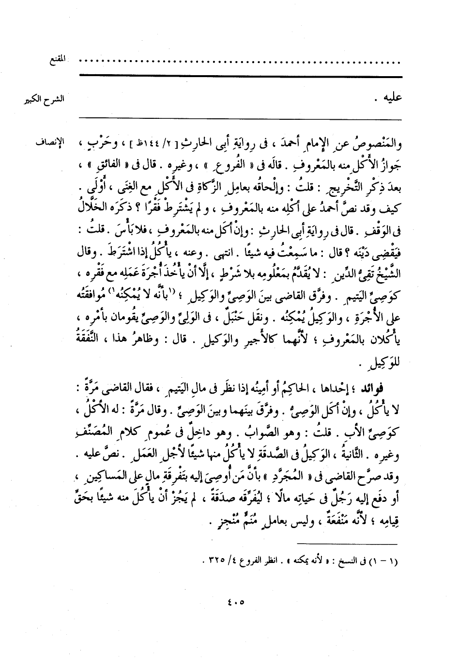 والمَنْصوصُ عنِ الإمام أحمدَ، في رِوايَةِ أبِي الحارِثِ، وحَرْبٍ، جَوازُ الأَكْل مِنه بالمَعْروفِ. قاله في «الفُروعِ»، وغيرِه. قال في «الفائقِ»، بعدَ ذِكْرِ التَّخْرِيجِ: قلتُ: وإلْحاقُه بعامِلِ الزَّكاةِ في الأكْلِ مع الغِنَى، أوْلَى. كيف وقد نصَّ أحمدُ على أكْلِه منه بالمَعْروفِ، ولم يَشْتَرِطْ فَقْرًا؛ ذكَرَه الخَلَّالُ في الوَقْفِ. قال في رِوايَةِ أبِي الحارِثِ: وإنْ أكَل منه بالمَعْروفِ، فلا بَأْسَ. قلتُ: فيَقْضِي دَينَه؟ قال: ما سَمِعْتُ فيه شيئًا. انتهى. وعنه، يأْكُلُ إذا اشْتَرَطَ. وقال الشَّيخُ تَقِيُّ الدِّين: لا يُقَدَّمُ بمَعْلُومِه بلا شَرْطٍ، إلَّا أنْ يأْخُذَ أُجْرَةَ عَمَلِه مع فَقْرِه، كوَصِيِّ اليَتيمِ. وفرَّق القاضي بينَ الوَصِيِّ والوَكِيلِ؛ [بأنَّه لا يُمْكِنُه] (¬1) مُوافقتُه على الأُجْرَةِ، والوَكِيلُ يُمْكِنُه. ونقَل حَنْبَلٌ، في الوَلِيِّ والوَصِي يقُومان بأمْرِه، يأْكلان بالمَعْروفِ؛ لأنَّهما كالأَجيرِ والوَكيلِ. قال: وظاهرُ هذا، النَّفَقَة للوَكِيلَ.