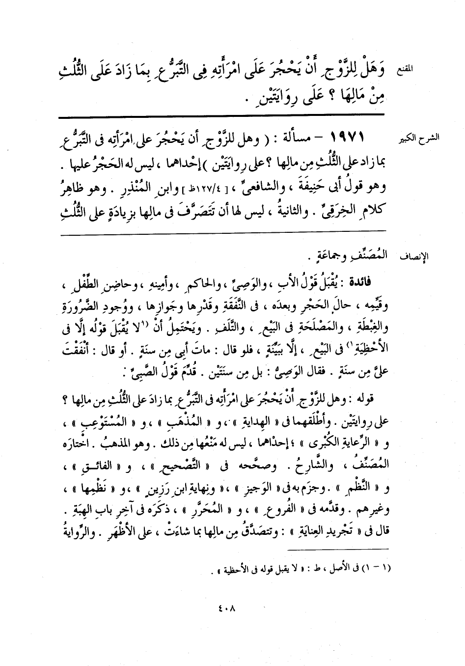 قوله: وهل للزَّوْجِ أنْ يَحْجُرَ على امْرَأتِه في التَّبَرُّعِ بما زادَ على الثُّلُثِ مِن مالِها؟ على رِوايتَين. وأطْلَقهما في «الهِدايةِ»، و «المُذْهَبِ»، و «المُسْتَوْعِبِ»، و «الرِّعايةِ الكُبْرى»؛ إحدْاهما، ليس له مَنْعُها مِن ذلك. وهو المذهبُ. اخْتارَه المُصَنِّفُ، والشَّارِحُ. وصحَّحه في «التَّصْحيحِ»، و «الفائقِ»، و «النَّظْمِ». وجزَم به في «الوَجيزِ»، «نِهايةِ ابنِ رَزِينٍ»، و «نَظْمِها»، وغيرِهم. وقدَّمه في «الفُروعِ»، و «المُحَرَّرِ»، ذكَرَه في آخِرِ بابِ الهِبَةِ. قال في «تَجْريدِ العِنايَةِ»: وتتصَدَّقُ مِن مالِها بما شاءَتْ، على الأظْهَرِ. والرِّوايةُ