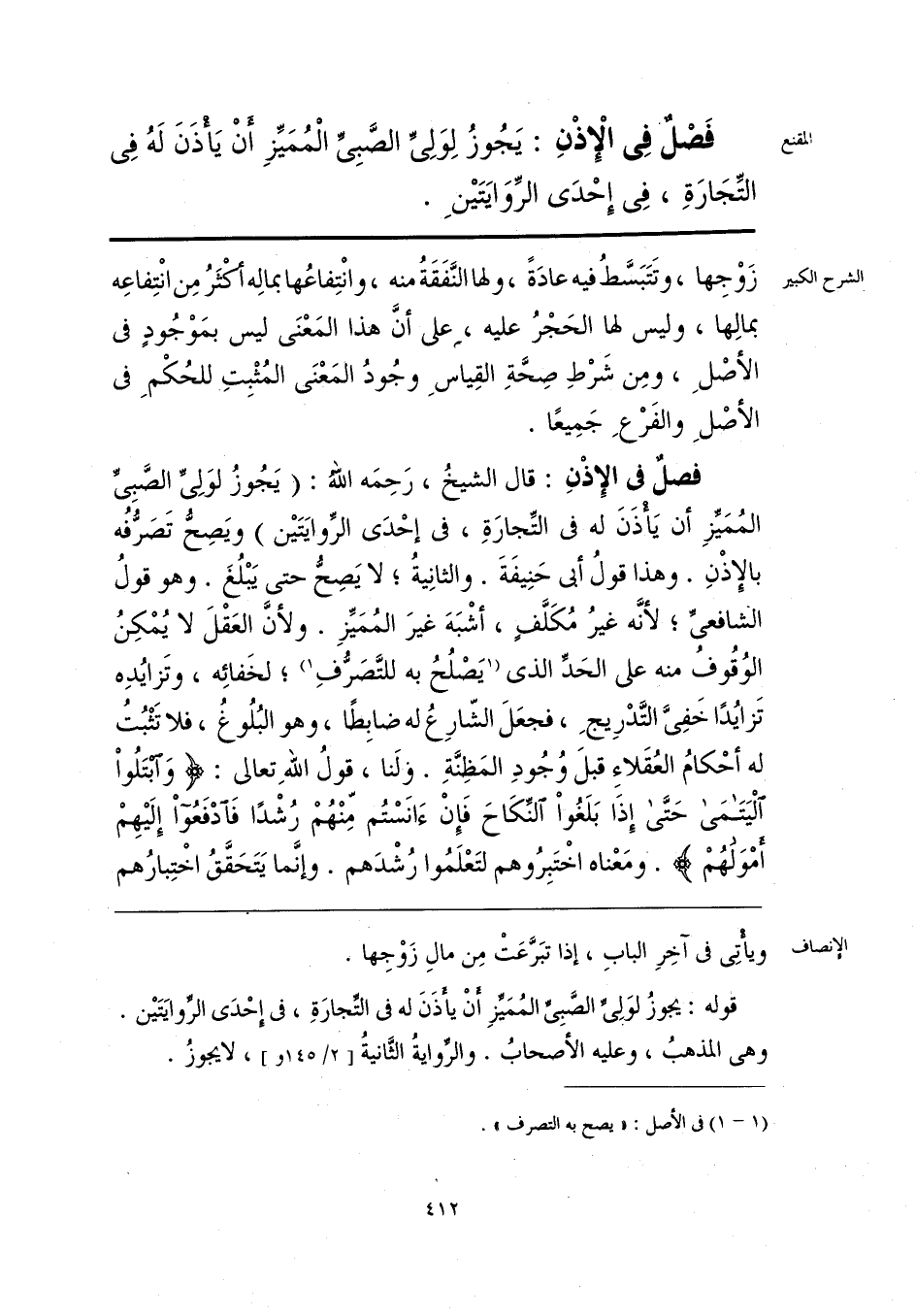 فصْلٌ فِي الإذْنِ: يَجُوزُ لِوَلِيِّ الصَّبِيِّ الْمُمَيِّزِ أنْ يَأْذَنَ لَهُ فِي التِّجَارَةِ، فِي إحْدَى الرِّوَايَتَينِ.