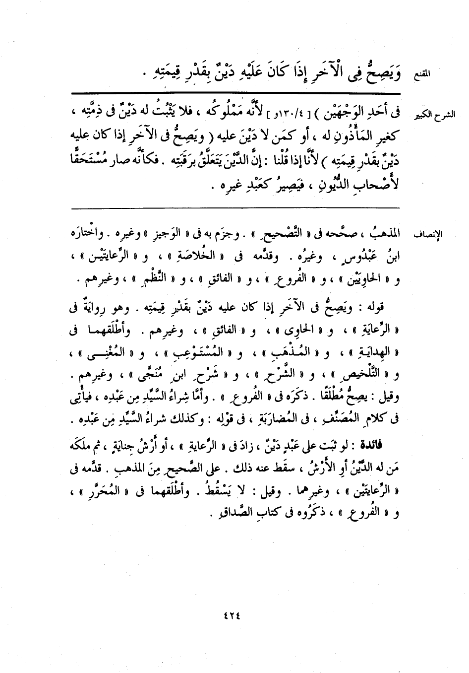 قوله: ويَصِح في الآخَرِ إذا كان عليه دَين بقَدْرِ قِيمَتِه. وهو رِوايَة في «الرعايَةِ»، و «الحاوي»، و «الفائقِ»، وغيرِهم. وأطْلَقهما في «الهِدايَةِ»، و «المُذْهَبِ»، و «المُسْتَوْعِبِ»، و «المُغْنِي»، و «التَّلْخيصِ»، و «الشَّرْحِ»، و «شَرْحِ ابنِ مُنَجَّى»، وغيرِهم. وقيل: يصِحُّ مُطْلَقًا. ذكَرَه في «الفُروعِ». وأمَّا شِراءُ السَّيِّدِ مِن عَبْدِه، فيأْتِي في كلامِ المُصَنِّفِ، في المُضارَبَةِ، في قوْله: وكذلك شراءُ السَّيِّدِ مِن عَبْدِه.