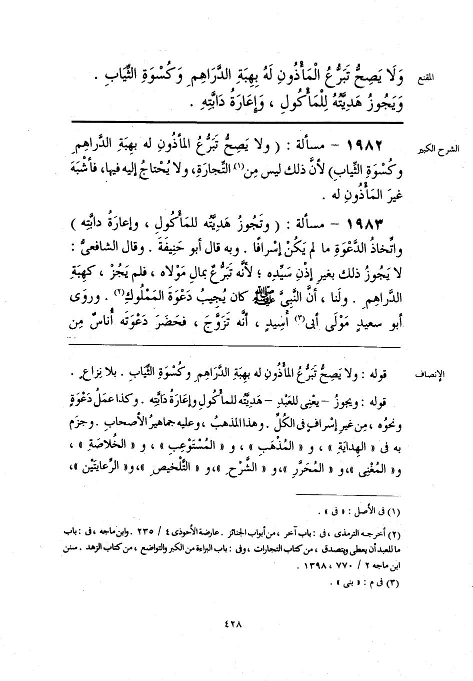 قوله: ويجوزُ -يعْنِي للعَبْدِ- هَدِيَّتُه للمأْكُولِ وإعَارَةُ دَابَّتِه. وكذا عمَلُ دَعْوَةٍ ونحوُه، مِن غيرِ إسْرافٍ في الكُلِّ. وهذا المذهبُ، وعليه جماهيرُ الأصحابِ. وجزَم به في «الهِدايَةِ»، و «المُذْهَبِ»، و «المُسْتَوْعِبِ»، و «الخُلاصَةِ»، و «المُغْنِي»، و «المُحَررِ»، و «الشرْحِ»، و «التلْخيصِ»، و «الرِّعايتَين»،
