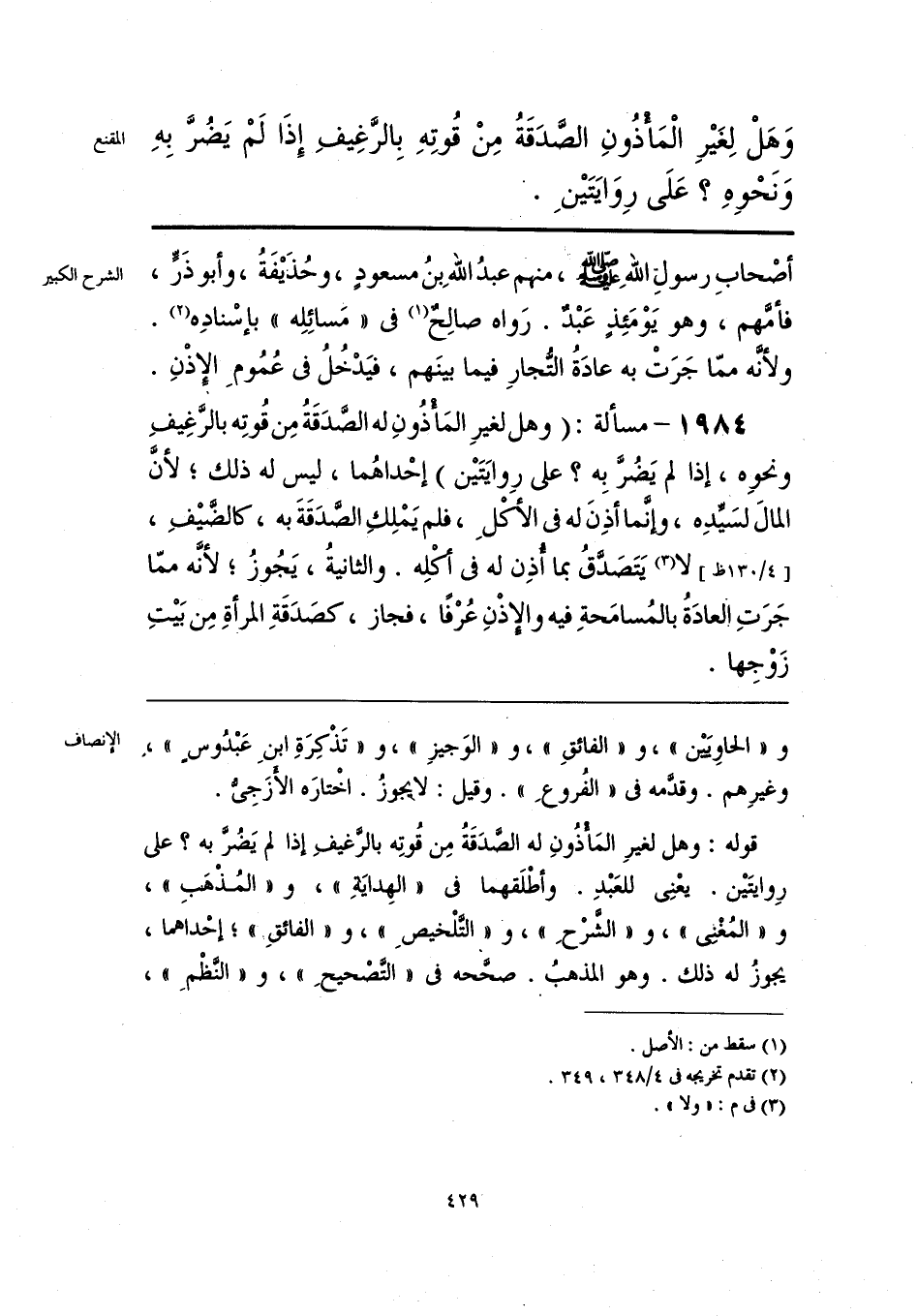 قوله: وهل لغيرِ المَأْذُونِ له الصَّدَقَةُ مِن قُوتِه بالرَّغيفِ إذا لم يَضُرَّ به؟ على رِوايتَين. يعْنِي للعَبْدِ. وأطْلَقهما في «الهِدايَةِ»، و «المُذْهَبِ»، و «المُغْني»، و «الشرْحِ»، و «التَّلْخيصِ»، و «الفائقِ»؛ إحْداهما، يجوز له ذلك. وهو المذهبُ. صحَّحه في «التَّصْحيحِ»، و «النَّظْمِ»،