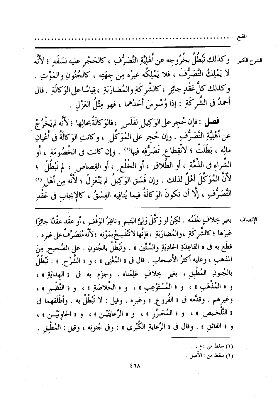 بغيرِ خِلافٍ نعْلَمُه. لكِنْ لو وَكَّلَ وَلِيُّ اليَتيمِ وناظِرُ الوَقْفِ، أو عقَد عقْدًا جائِزًا غيرَها؛ كالشرِكَةِ، والمُضارَبَةِ، فإنها لا تَنْفَسِخُ بمَوْتِه؛ لأنَّه مُتَصَرِّفٌ على غيرِه. قطَع به في «القاعِدَةِ الحادِيَةِ والسِّتِّين». وتَبْطُلُ بالجُنونِ. على الصَّحيحِ مِنَ المذهبِ، وعليه أكثرُ الأصحابِ. قال في «المُغْنِي»، و «الشَّرْحِ»: تَبْطُلُ بالجُنونِ المُطْبِقِ، بغيرِ خِلافٍ عَلِمْناه. وجزَم به في «الهِدايَةِ»، و «المُذْهَبِ»، و «المُسْتَوْعبِ»، و «الخُلاصَةِ»، و «النَّظْمِ»، وغيرِهم. وقدَّمه في «الفُروعِ» وغيرِه. وقيل: لا تَبْطُلُ به. وأطْلَقهما في «التَّلْخيصِ»، و «المُحَررِ»، و «الرعايتَين»، و «الحاويَيْن»، و «الفائقِ». وقال في «الرعايةِ الكُبْرى»: وفي جُنونِه، وقيل: المُطبِقِ.