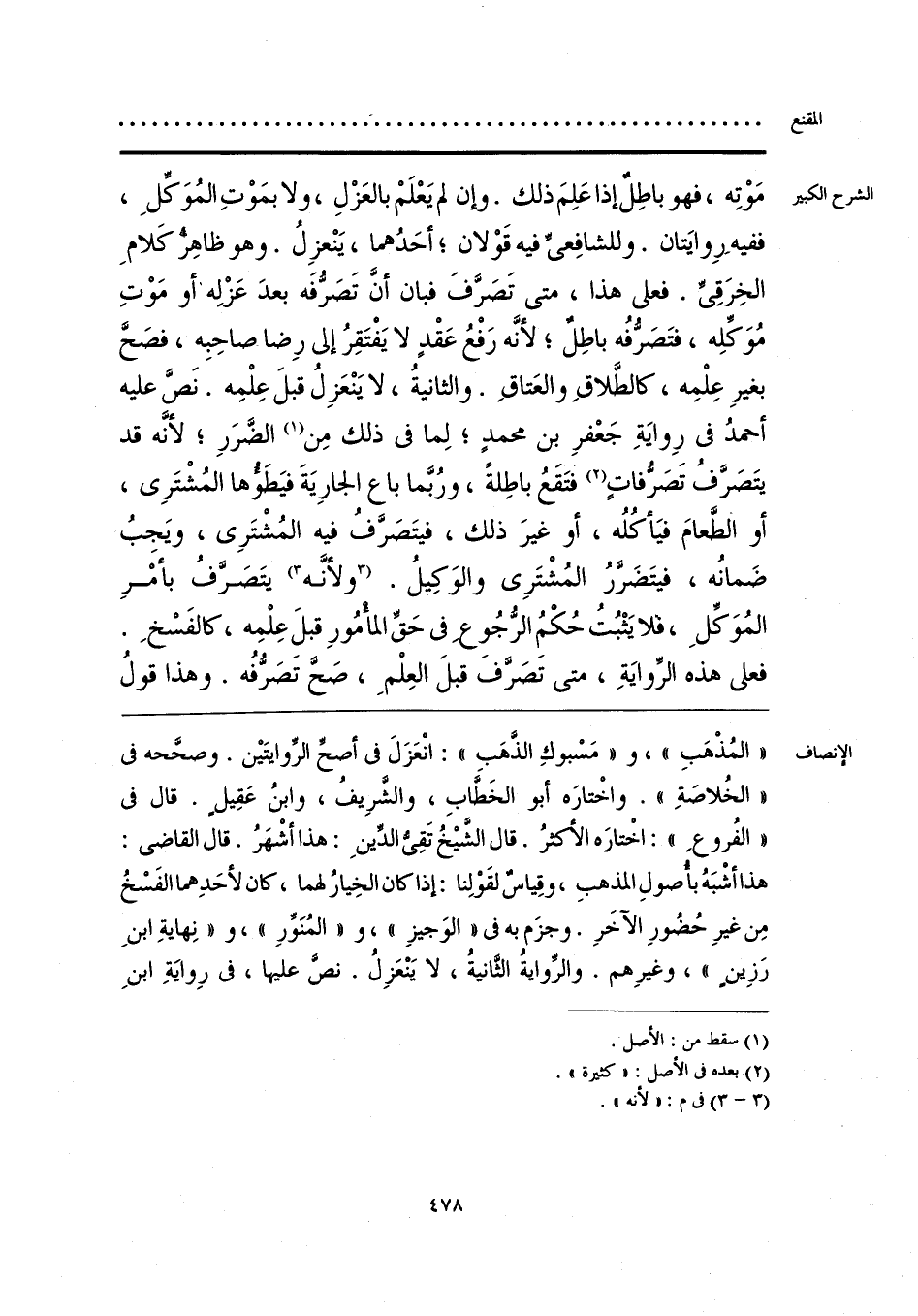 «المُذْهَبِ»، و «مَسْبوكِ الذَّهب»: انْعَزَلَ في أصحِّ الرِّوايتَين. وصحَّحه في «الخُلاصَةِ». واخْتارَه أبو الخَطَّابِ، والشَّرِيفُ، وابنُ عَقِيلٍ. قال في «الفُروعِ»: اخْتارَه الأكثرُ. قال الشَّيخُ تَقِيُّ الدِّينِ: هذا أشْهَرُ. قال القاضي: هذا أشْبَهُ بأُصولِ المذهبِ، وقِياسٌ لقَوْلِنا: إذا كان الخِيارُ لهما، كان لأحَدِهما الفَسْخُ مِن غيرِ حُضُورِ الآخَرِ. وجزَم به في «الوَجيزِ»، و «المُنَوِّرِ»، و «نِهايةِ ابنِ رَزِينٍ»، وغيرِهم. والرِّوايةُ الثَّانيةُ، لا يَنْعَزِلُ. نصَّ عليها، في رِوايَةِ ابنِ