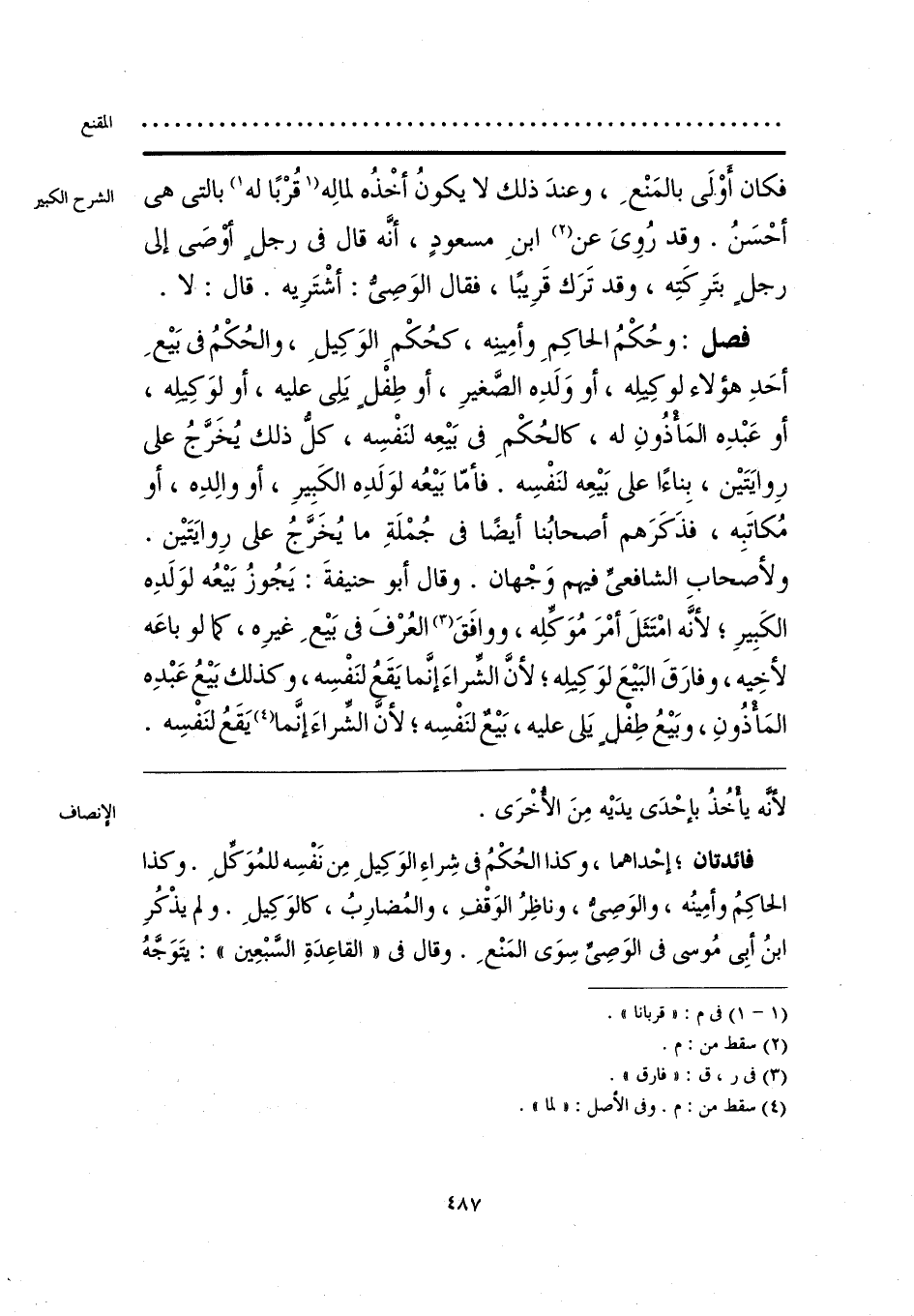 فائدتان؛ إحْداهما، وكذا الحُكْمُ في شِراءِ الوَكِيلِ مِن نَفْسِه للمُوَكِّلِ. وكذا الحاكِمُ وأمِينُه، والوَصِيُّ، وناظِرُ الوَقْفِ، والمُضارِبُ، كالوَكِيلِ. ولم يذْكُرِ ابنُ أبِي مُوسى في الوَصِيِّ سِوَى المَنْعِ. وقال في «القاعِدَةِ السَّبْعِين»: يتَوَجَّهُ