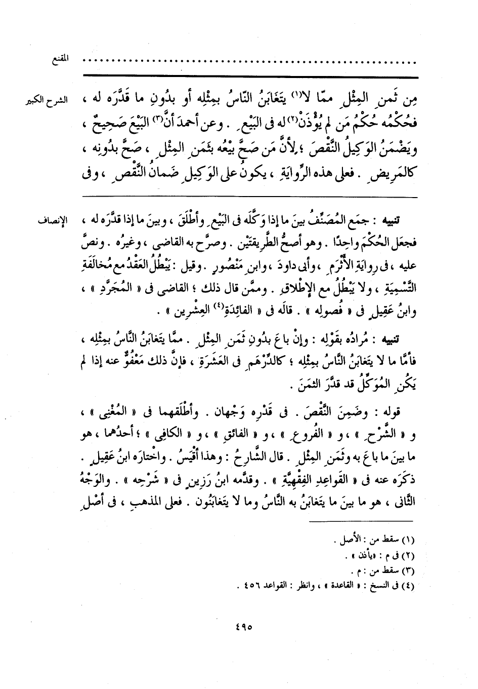 تنبيه: مُرادُه بقَوْلِه: وإنْ باعَ بدُونِ ثَمَنِ المِثْلِ. ممَّا يتَغابَنُ النَّاسُ بمِثْلِه، فأمَّا ما لا يتَغابَنُ النَّاسُ بمِثْلِه؛ كالدِّرْهَمِ في العَشَرَةِ، فإنَّ ذلك مَعْفُوٌّ عنه إذا لم يَكُنِ المُوَكِّلُ قد قدَّرَ الثمَنَ.