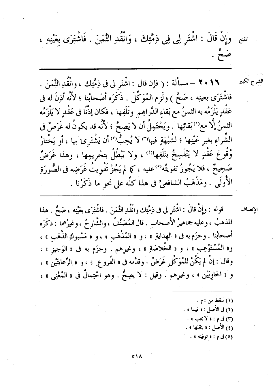 قوله: وإِنْ قال: اشْتَرِ لي في ذِمَّتِك وانْقُدِ الثَّمَنَ. فاشْتَرَى بعَينِه، صَحَّ. هذا المذهبُ، وعليه جماهيرُ الأصحابِ. قال المُصَنِّفُ، والشَّارِحُ، وغيرُهما: ذكَرَه أصحابُنا. وجزَم به في «الهِدايةِ»، و «المُذْهَبِ»، و «مَسْبوكِ الذَّهَبِ»، و «المُسْتَوْعِبِ»، و «الخُلاصَةِ»، وغيرِهم. وجزَم به في «الوَجيزِ»، وقال: إنْ لم يَكُنْ للمُوَكِّلِ غَرَضٌ. وقدَّمه في «الفُروعِ»، و «الرِّعايتَين»، و «الحاويَيْن»، وغيرِهم. وقيل: لا يصِحُّ. وهو احْتِمالٌ في «المُغْنِي»،