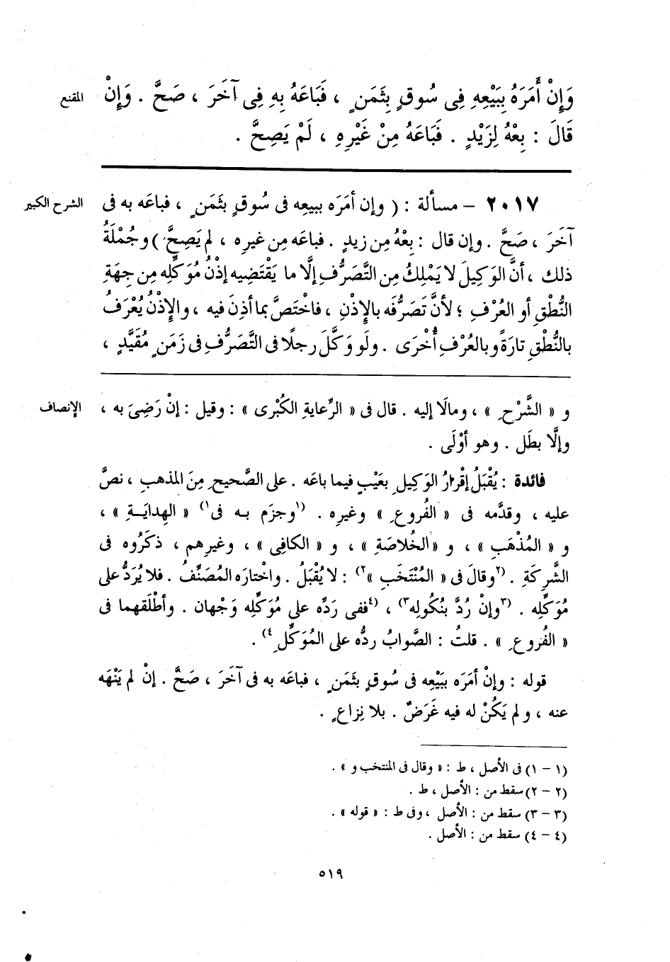فائدة: يُقْبَلُ إقْرارُ الوَكِيلِ بعَيب فيما باعَه. على الصَّحيحِ مِنَ المذهبِ، نصَّ عليه، وقدَّمه في «الفُروعِ» وغيرِه. [وجزَم به في] (¬1) «الهِدايَةِ»، و «المُذْهَبِ»، و «الخُلاصَةِ»، و «الكافِي»، وغيرِهم، ذكَرُوه في الشَّرِكَةِ. [وقال في «المُنْتَخَبِ»] (¬2): لا يُقْبَلُ. واخْتارَه المُصَنِّفُ. فلا يُرَدُّ على مُوَكِّلِه. [وإنْ رُدَّ بنُكُولِه] (¬3)، [ففي رَدِّه على مُوَكِّلِه وَجْهان. وأطْلَقهما في «الفُروعِ». قلتُ: الصَّوابُ ردُّه على المُوَكِّلِ] (¬4).