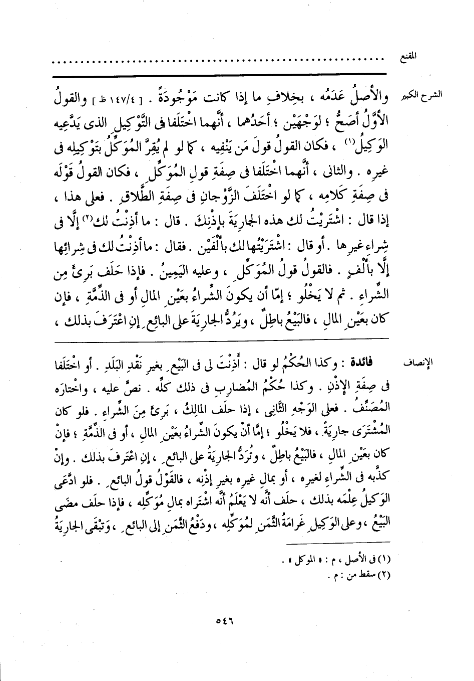 فائدة: وكذا الحُكْمُ لو قال: أَذِنْتَ لي في البَيعِ بغيرِ نَقْدِ البَلَدِ. أو اخْتَلَفا في صِفَةِ الإِذْنِ. وكذا حُكْمُ المُضارِبِ في ذلك كلِّه. نصَّ عليه، واخْتارَه المُصَنِّفُ. فعلى الوَجْهِ الثَّانِي، إذا حلَف المالِكُ، بَرِئَ مِنَ الشِّراءِ. فلو كان المُشْتَرَى جارِيَةً، فلا يَخْلُو؛ إمَّا أنْ يكونَ الشِّراءُ بعَينِ المالِ، أو في الذِّمَّةِ؛ فإنْ كان بعَيْنِ المالِ، فالبَيعُ باطِلٌ، وتُرَدُّ الجارِيَةُ على البائعِ، إنِ اعْتَرفَ بذلك. وإنْ كذَّبه في الشِّراءِ لغيرِه، أو بمالِ غيرِه بغيرِ إذْنِه، فالقَوْلُ قولُ البائعِ. فلو ادَّعَى الوَكيلُ عِلْمَه بذلك، حلَف أنَّه لا يَعْلَمُ أنَّه اشْتَراه بمالِ مُوَكِّلِه، فإذا حلَف مضَى البَيعُ، وعلى الوَكِيلِ غَرامَةُ الثَّمَنِ لمُوَكِّلِه، ودَفْعُ الثَّمَنِ إلى البائعِ، وَتبْقَى الجارِيَةُ