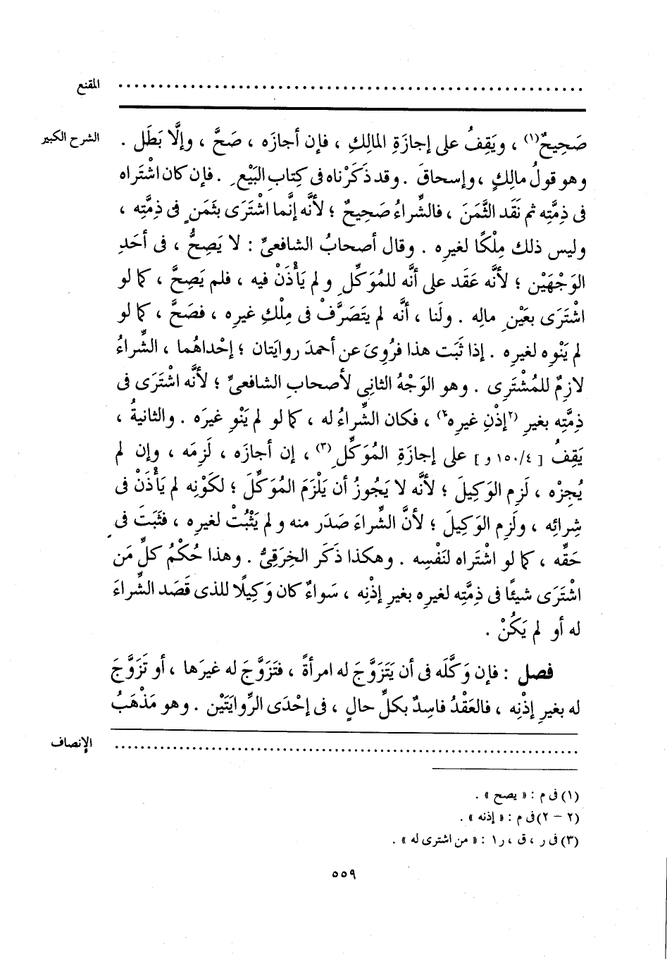 صَحِيحٌ (¬1)، ويَقِفُ على إجازَةِ المالِكِ، فإن أجازَه، صَحَّ، وإلَّا بَطَل. وهو قولُ مالِكٍ، وإسحاقَ. وقد ذَكَرْناه في كِتابِ البَيعِ. فإن كان اشْتَراه في ذِمَّتِه ثم نَقَد الثَّمَنَ، فالشِّراءُ صَحِيحٌ؛ لأنَّه إنَّما اشْتَرَى بثَمَنٍ في ذِمَّتِه، وليس ذلك مِلْكًا لغيرِه. وقال أصحابُ الشافعيِّ: لا يَصِحُّ، في أحَدِ الوَجْهَين؛ لأنَّه عَقَد على أنَّه للمُوَكِّلِ ولم يَأْذَنْ فيه، فلم يَصِحَّ, كما لو اشْتَرَى بعَيْنِ مالِه. ولَنا، أنَّه لم يتَصَرَّفْ في مِلْكِ غيرِه، فصَحَّ, كما لو لم يَنْوه لغيرِه. إذا ثَبَت هذا فرُوِيَ عن أحمدَ روايَتان؛ إحْداهُما، الشِّراءُ لازِمٌ للمُشْتَرِي. وهو الوَجْهُ الثانِي لأصحابِ الشافعيِّ؛ لأنَّه اشْتَرَى في ذِمَّتِه بغيرِ [إذْنِ غيرِه] (¬2)، فكان الشِّراءُ له, كما لو لم يَنْو غيرَه. والثانيةُ، يَقِفُ على إجازَةِ المُوَكِّلِ (¬3)، إن أجازَه، لَزِمَه، وإن لم يُجِزْه، لَزِم الوَكِيلَ؛ لأنَّه لا يَجُوزُ أن يَلْزَمَ المُوَكِّلَ؛ لكَوْنِه لم يَأْذَنْ في شِرائِه، ولَزِم الوَكِيلَ؛ لأنَّ الشِّراءَ صَدَر منه ولم يَثْبُتْ لغيرِه، فثَبَتَ في حَقِّه, كما لو اشْتَراه لنَفْسِه. وهكذا ذَكَر الخِرَقِيُّ. وهذا حُكْمُ كلِّ مَن اشْتَرَى شيئًا في ذِمَّتِه لغيرِه بغيرِ إذْنِه، سَواءٌ كان وَكِيلًا للذي قَصَد الشِّراءَ له أو لم يَكُنْ.