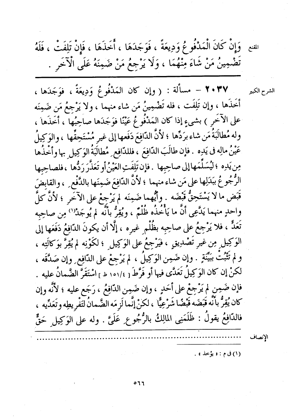 وَإِنْ كَانَ الْمَدْفُوعُ وَدِيعَةً، فَوَجَدَهَا، أَخَذَهَا، فَإِنْ تَلِفَتْ، فَلَهُ تَضْمِينُ مَنْ شَاءَ مِنْهُمَا، وَلَا يَرْجِعُ مَنْ ضَمِنَهُ عَلَى الْآخَرِ.