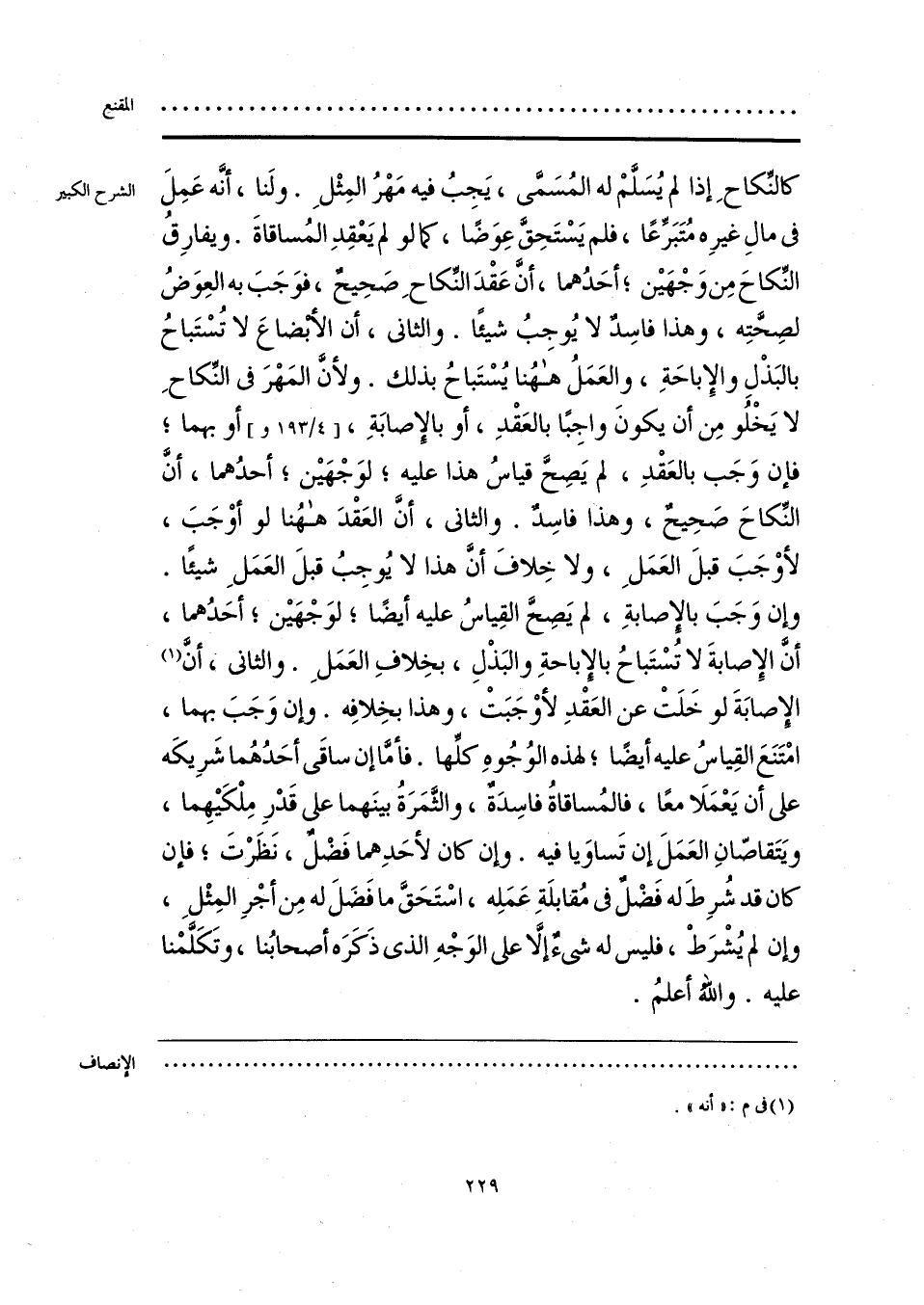 كالنِّكاحِ إذا لم يُسَلَّمْ له المُسَمَّى، يَجِبُ فيه مَهْرُ المِثْلِ. ولَنا، أنَّه عَمِلَ في مالِ غيرِه مُتَبَرعًا، فلم يَسْتَحِقَّ عِوَضًا، كما لو لم يَعْقِدِ المُساقاةَ. ويفارِق النِّكاحَ مِن وَجْهَين؛ أحَدُهما، أنَّ عَقْدَ النِّكاحِ صَحِيحٌ، فوَجَبَ به العِوَضُ لصِحَّتِه، وهذا فاسِدٌ لا يُوجِبُ شيئًا. والثاني، أن الأبْضاعَ لا تُسْتَباحُ بالبَذْلِ والإِباحَةِ، والعَمَلُ ههُنا يُسْتَباحُ بذلك. ولأنَّ المَهْرَ في النِّكاحِ لا يَخْلُو مِن أن يكونَ واجِبًا بالعَقْدِ، أو بالإِصابَةِ، أو بهما؛ فإن وَجَب بالعَقْدِ، لم يَصِحَّ قياسُ هذا عليهكما لوَجْهَين؛ أحدُهما، أنَّ النِّكاحَ صَحِيحٌ، وهذا فاسِدٌ. والثاني، أنَّ العَقْدَ ههُنا لو أوْجَبَ، وإن وْجَبَ قبلَ العَمَلِ، ولا خِلافَ أنَّ هذا لا يُوجِبُ قبلَ العَمَلِ شيئًا. وإن وَجَبَ بالإصابةِ، لم يَصِحَّ القِياسُ عليه أيضًا؛ لوَجْهَين؛ أحَدُهما، أنَّ الإِصابةَ لا تُسْتَباحُ بالإِباحةِ والبَذْلِ، بخِلافِ العَمَلِ. والثاني، أنَّ (¬1) الإصابَةَ لو خَلَتْ عن العَقْدِ لأوْجَبَتْ، وهذا بخِلافِه. وإن وَجَبَ بهما، امْتَنَعَ القِياسُ عليه أيضًا؛ لهذه الوُجُوهِ كلِّها. فأمَّا إن ساقَى أحَدُهُما شَرِيكَه على أن يَعْمَلَا معًا، فالمُساقاةُ فاسِدَةٌ، والثَّمَرَةُ بينَهما على قَدْرِ مِلْكَيهِما، ويَتَقاصّانِ العَمَلَ إن تَساوَيا فيه. وإن كان لأحَدِهما فَضْلٌ، نَظَرْتَ؛ فإن كان قد شُرِطَ له فَضْلٌ في مُقابلَةِ عَمَلِه، اسْتَحَقَّ ما فَضَلَ له مِن أجْرِ المِثْلِ، وإن لم يُشْرَطْ، فليس له شيءٌ إلَّا على الوَجْهِ الَّذي ذَكَرَه أصحابُنا، وتَكَلَّمْنا عليه. واللهُ أعلمُ.