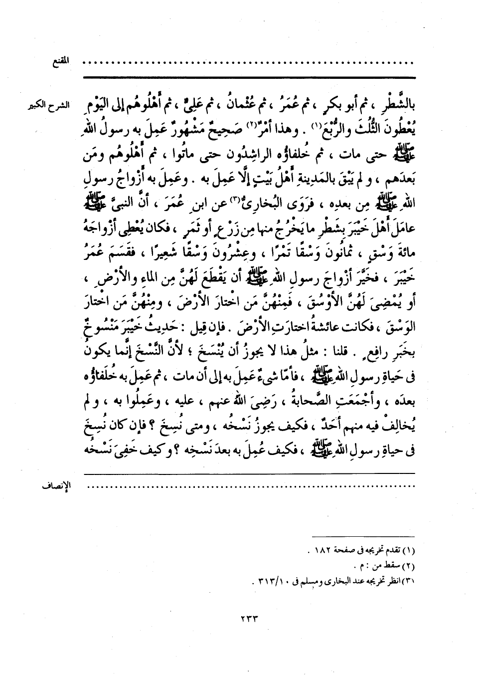 بالشَّطْرِ، ثم أبو بكرٍ، ثم عُمَرُ، ثم عُثْمانُ، ثم عَلِيٍّ، ثم أَهْلُوهُم إلى اليَوْم يُعْطُونَ الثُّلُثَ والرُّبْعَ (¬1). وهذا أمْرٌ (¬2) صَحِيحٌ مَشهُورٌ عَمِلَ به رسولُ اللهِ - صلى الله عليه وسلم - حتَّى مات، ثم خُلفاؤه الراشِدُون حتَّى ماتُوا، ثم أَهْلُوهُم ومَن بَعدَهم، ولم يَبْقَ بالمَدِينةِ أهْلُ بَيتٍ إلا عَمِلَ به. وعَمِلَ به أَزْواجُ رسولِ اللهِ - صلى الله عليه وسلم - مِن بعدِه، فرَوَى البُخارِيُّ (¬3) عن ابنِ عُمَرَ، أنَّ النبيَّ - صلى الله عليه وسلم - عامَلَ أَهَلَ خَيبَرَ بِشَطْرِ ما يَخْرُجُ منها مِن زَرْعٍ أو ثَمَرٍ، فكان يُعْطِي أزْواجَهُ مائةَ وَسْقٍ، ثمانُونَ وَسْقًا تَمْرًا، وعِشْرُون وَسْقًا شَعِيرًا، فقَسَمَ عُمَرُ خَيبَرَ، فخَيَّرَ أزْوْاجَ رسولِ اللهِ - صلى الله عليه وسلم - أن يَقْطَعَ لَهُنَّ مِن الماءِ والأرْضِ، أو يُمْضِيَ لَهُنَّ الأَوْسُقَ، فَمِنْهُنَّ مَن اخْتارَ الأرْضَ، ومِنْهُنَّ مَن اخْتارَ الوَسْقَ، فكانت عائشةُ اختارَتِ الأرْضَ. فإن قِيل: حَدِيثُ خَيبَرَ مَنسُوخٌ بخبَرِ رافِعٍ. قلنا: مثلُ هذا لا يجوزُ أن يُنْسَخَ؛ لأن النَّسْخَ إنَّما يكون في حَياةِ رسولِ الله - صلى الله عليه وسلم -، فأمّا شيءٌ عَمِلَ به إلى أن مات، ثم عَمِلَ به خُلَفاؤُه بعدَه، وأجْمَعَتِ الصَّحابةُ، رَضِيَ اللهَ عنهم، عليه، وعَمِلُوا به، ولم يُخالِفْ فيه منهم أحَدٌ، فكيف يجوزُ نَسْخُه، ومتى نُسِخَ؟ فإن كان نُسِخَ في حياةِ رسولِ الله - صلى الله عليه وسلم -، فكيف عُمِلَ به بعدَ نَسْخِه؟ وكيف خَفِيَ نَسْخُه
