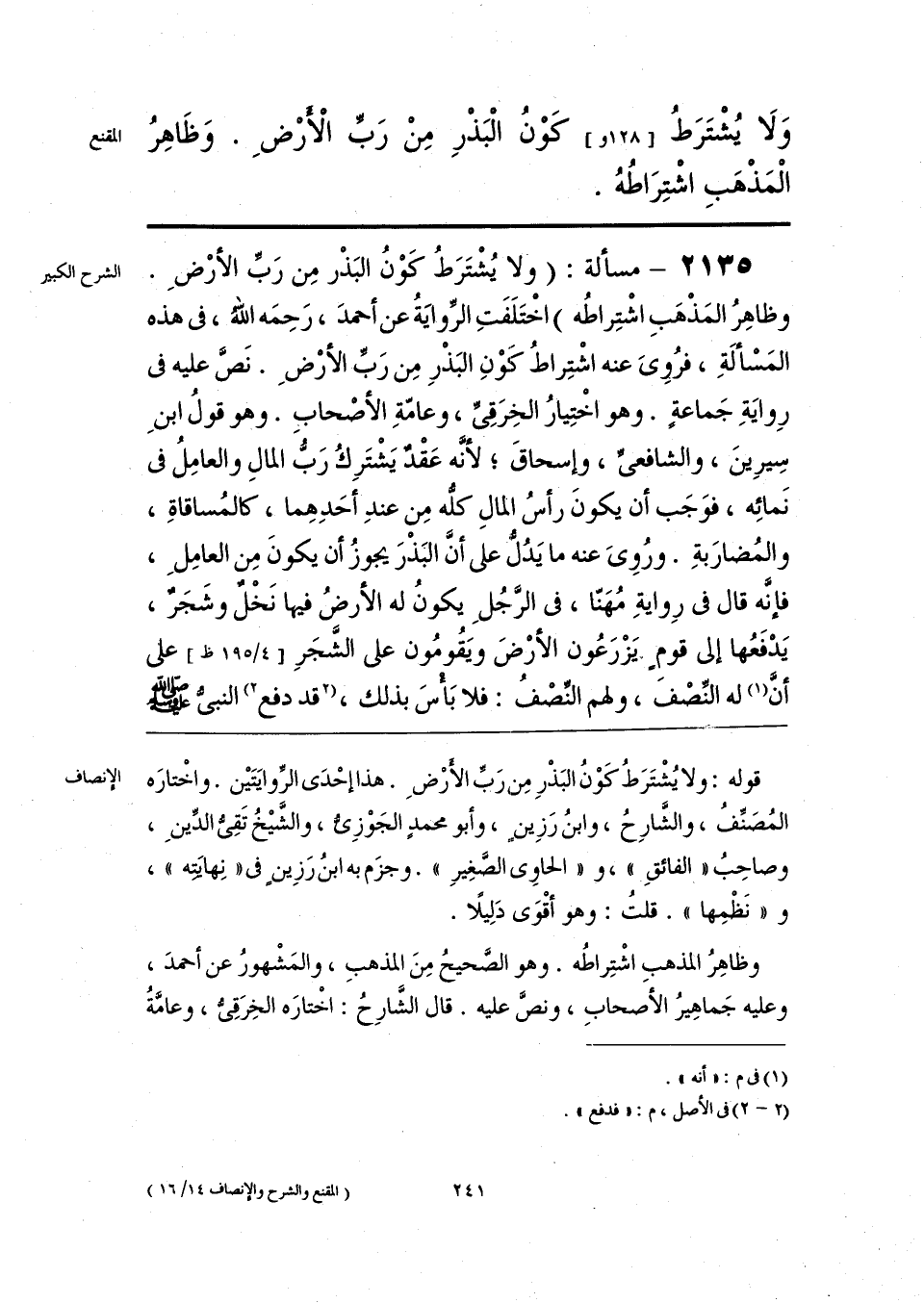 قوله: ولا يُشْتَرَطُ كَوْنُ البَذْرِ مِن رَبِّ الأَرْضِ. هذا إحْدَى الرِّوايَتَين. واخْتارَه المُصَنِّفُ، والشَّارِحُ، وابنُ رَزِينٍ، وأبو محمدٍ الجَوْزِيُّ، والشَّيخُ تَقِيُّ الدِّينِ، وصاحِبُ «الفائِق»، و «الحاوي الصَّغِيرِ». وجزَم به ابنُ رَزِينٍ في «نِهايَتِه»، و «نَظْمِها». قلتُ: وهو أقْوَى دَلِيلًا.