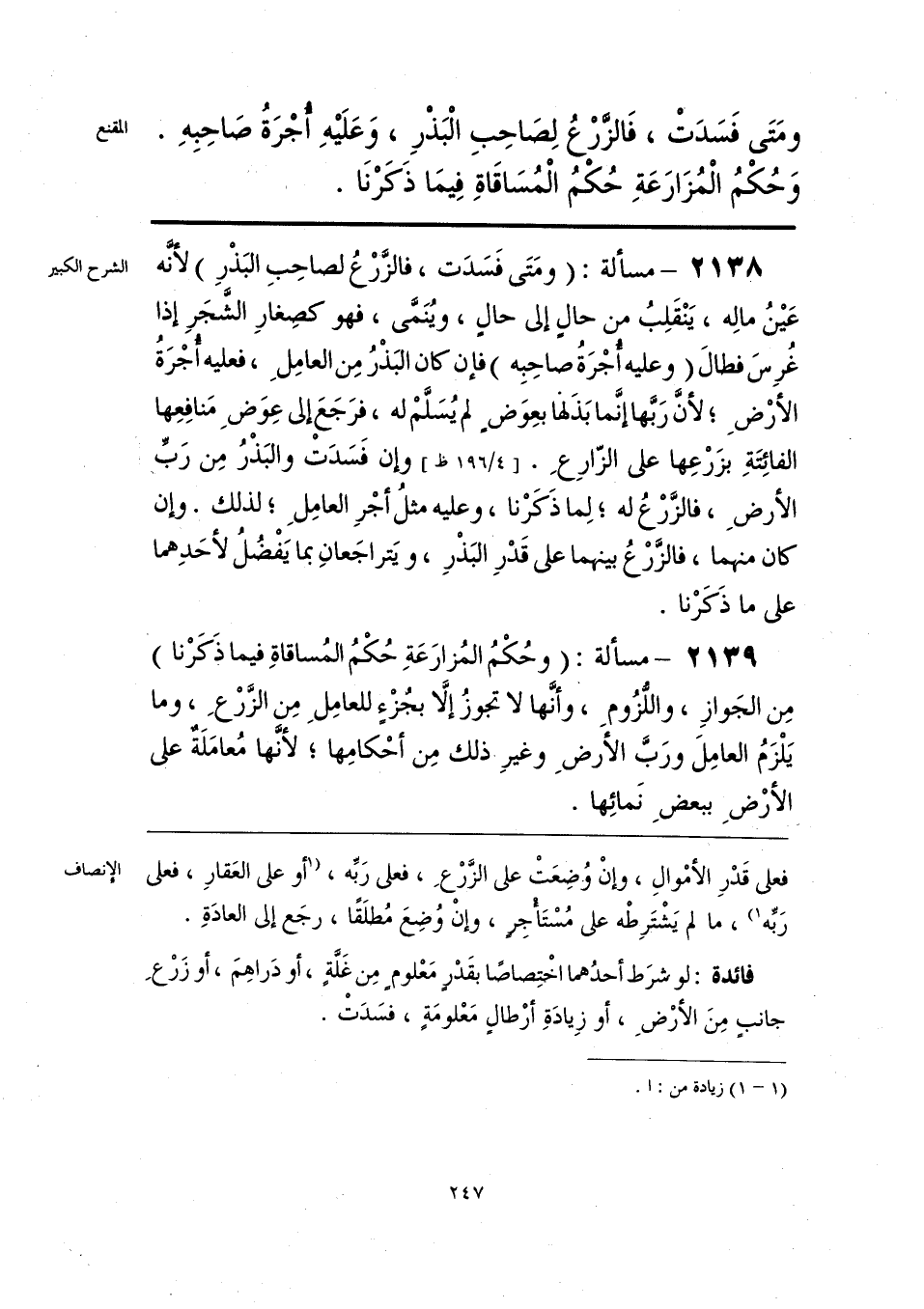 فائدة: لو شرَط أحدُهما اخْتِصاصًا بقَدْرٍ مَعْلوم مِن غَلةٍ، أو دَراهِمَ، أو زَرْعِ جانبٍ مِنَ الأرْضِ، أو زِيادَةِ أرْطالٍ مَعْلومَةٍ، فسَدَتْ.
